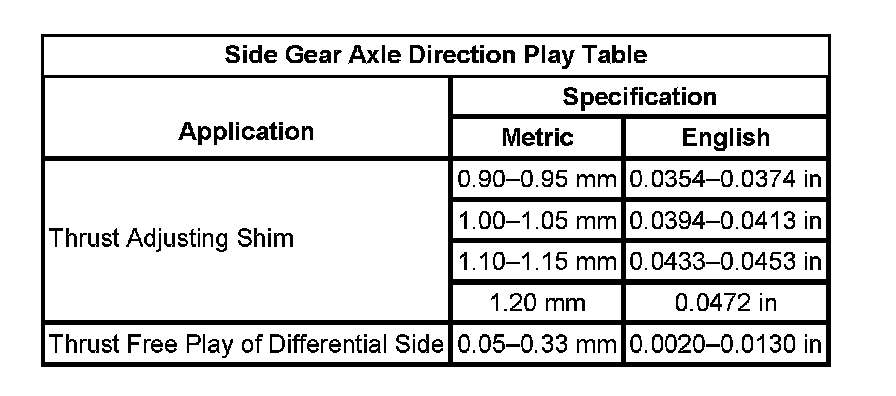Side Gear Axle Direction Play Table: