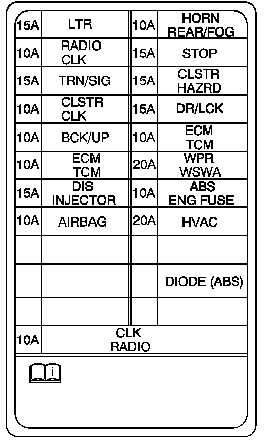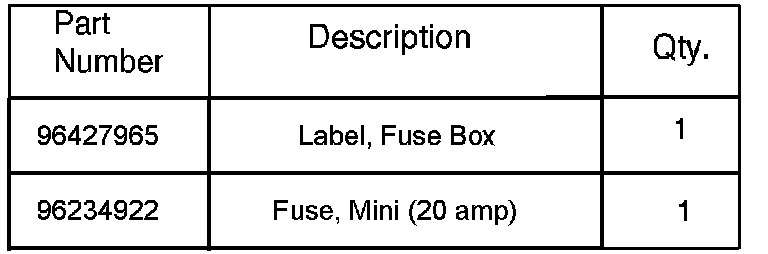 Replace the 15 amp fuse (F15) in the interior fuse panel with a 20 amp fuse, P/N 96234922, and replace the old label on the fuse panel cover with a new one. Close the door and verify that the RKE system functions properly.
