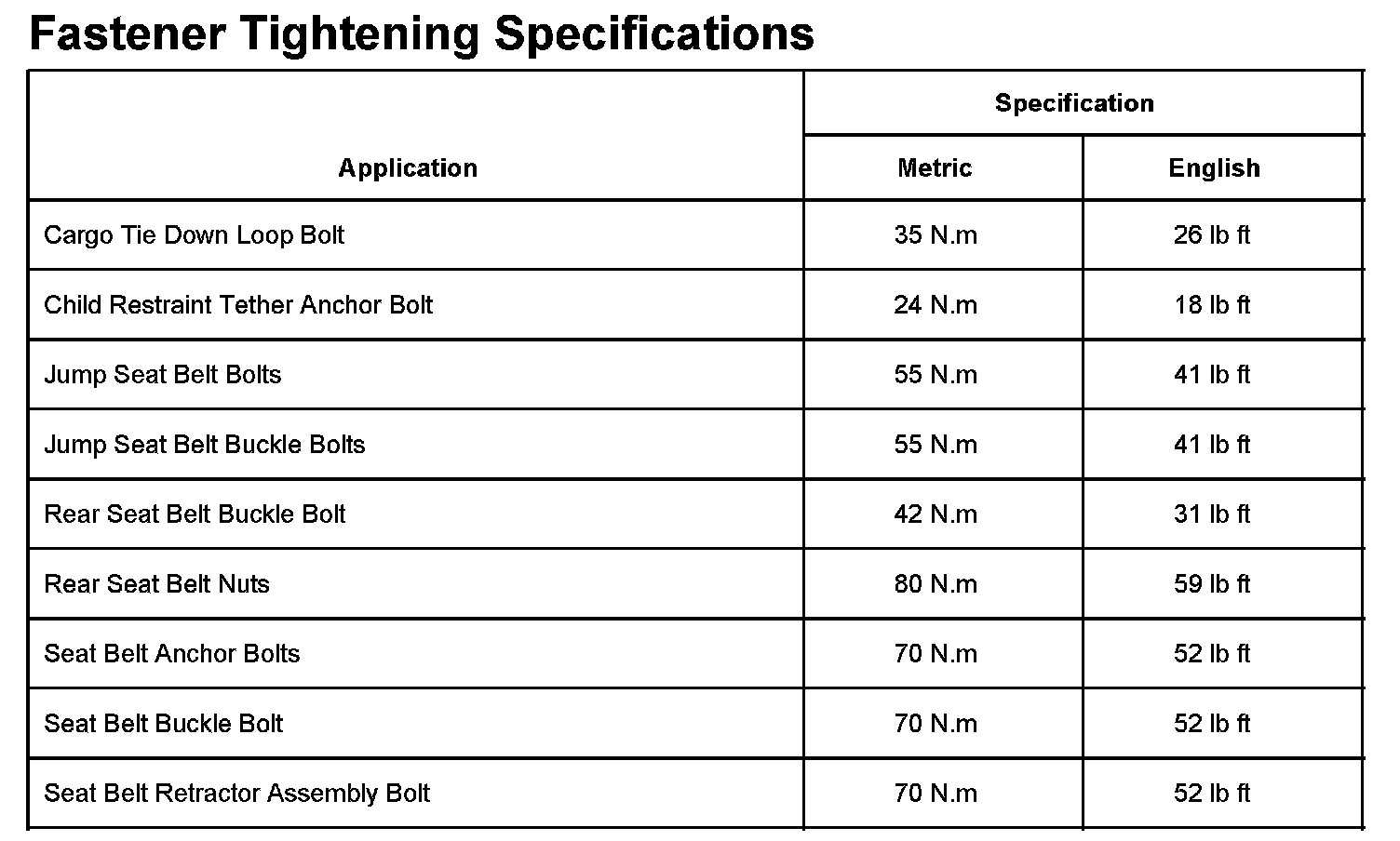 Fastener Tightening Specifications: