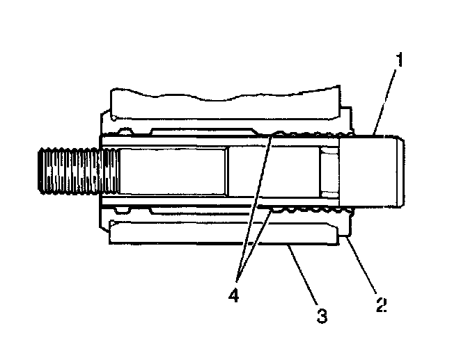 3. Apply a liberal amount of high temperature silicone brake lubricant to the interior of the NEW bushings (2). Ensure that the lubricant fills the cavities beside the ribs on the inside of the bushings (4).