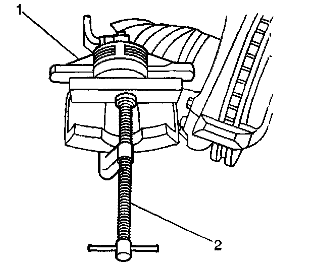 1. Install a large C-clamp (2) over the body of the brake caliper (1), with the C-clamp ends against the rear of the caliper body and against an old inboard brake pad or a wood block installed against the caliper piston.
