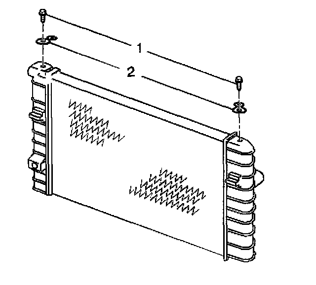 5. Remove the radiator upper mounting bolts (1) and the upper radiator mounts (2).
