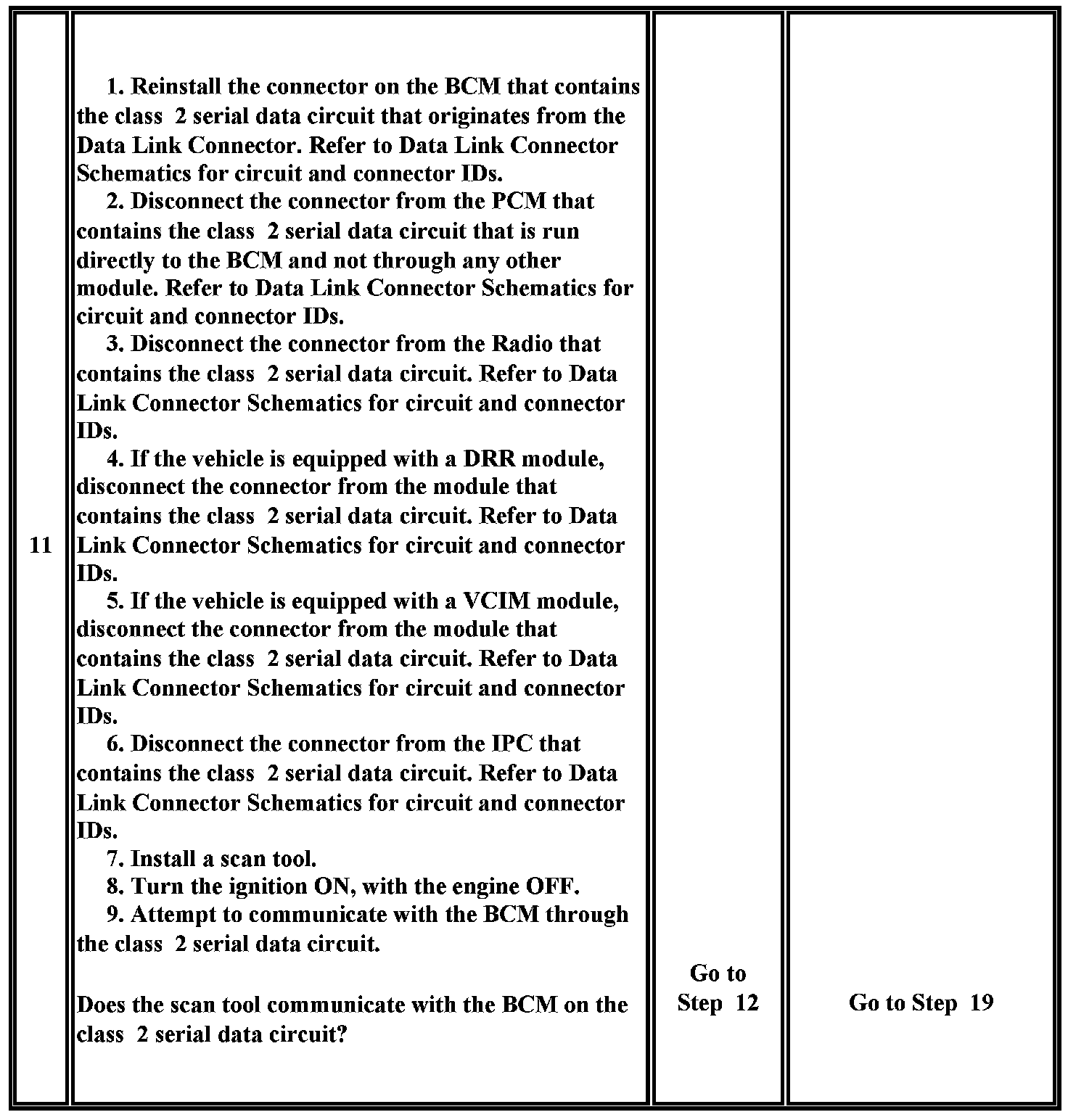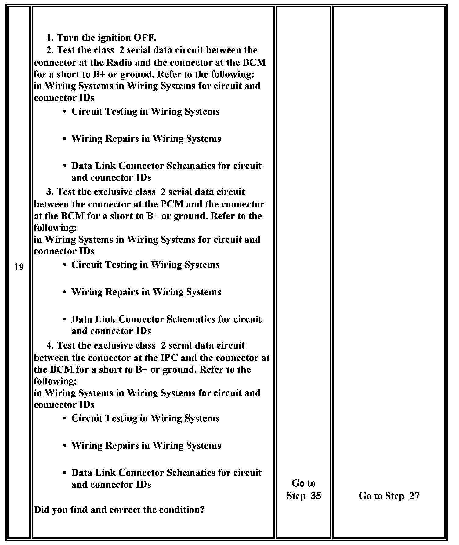 19. This test analyzes the condition of the wiring and connectors in the class 2 serial data circuit of the BCM.