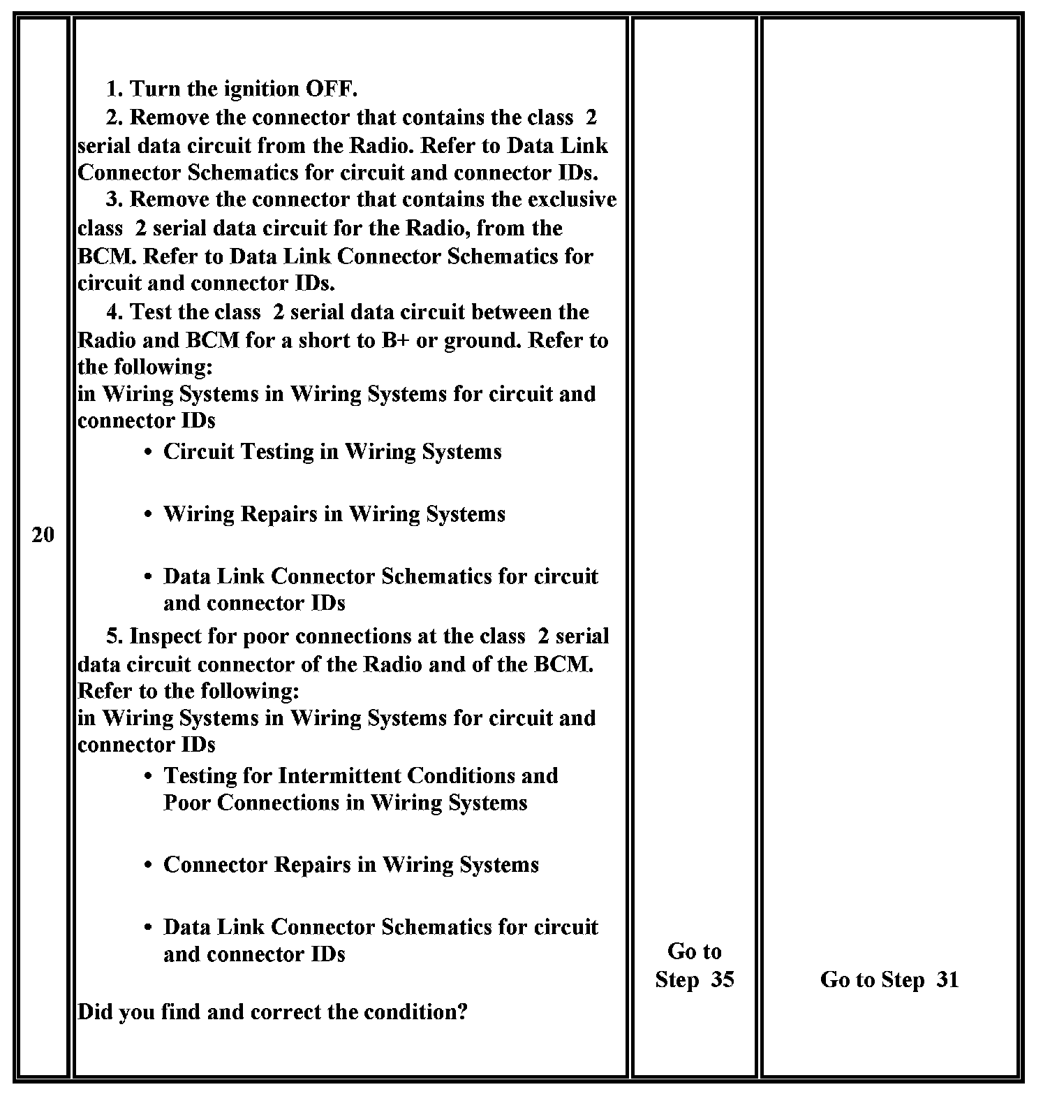 20. This test analyzes the condition of the wiring and connectors in the class 2 serial data circuit of the Radio.