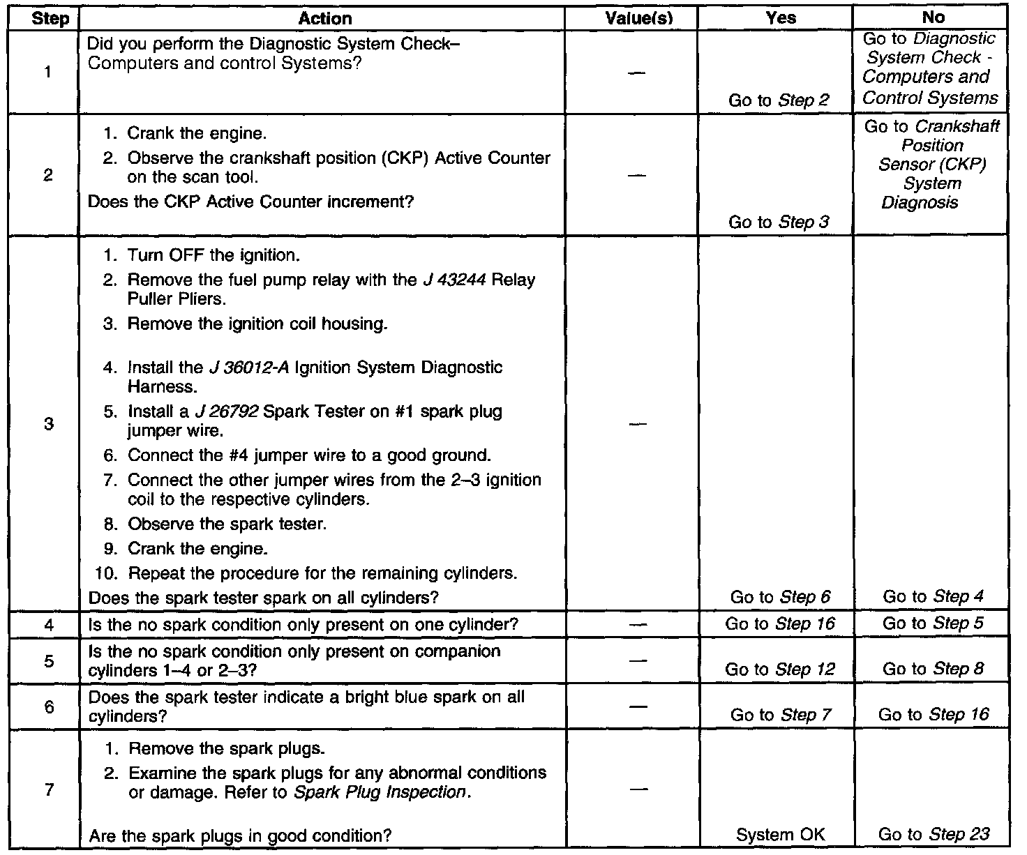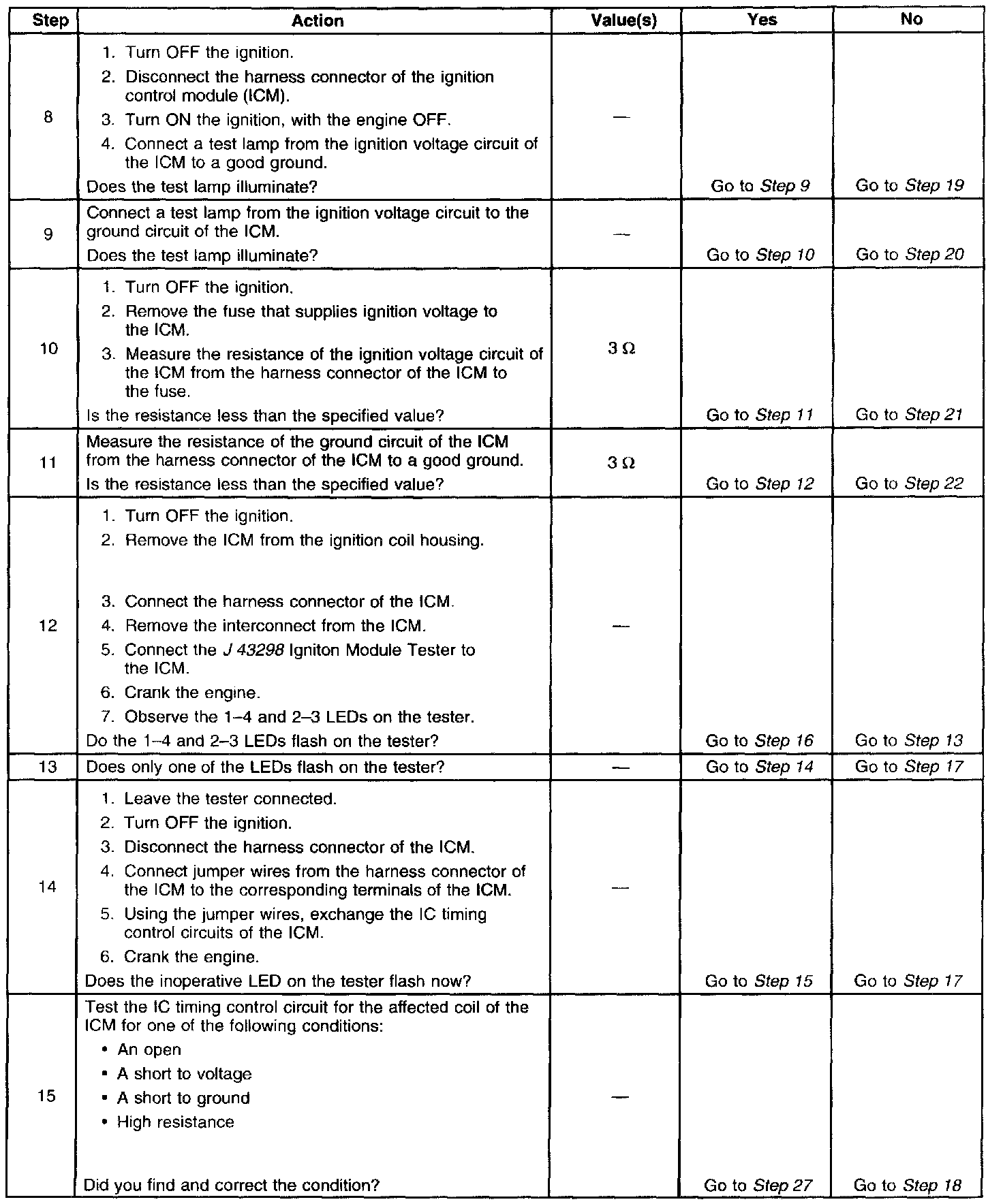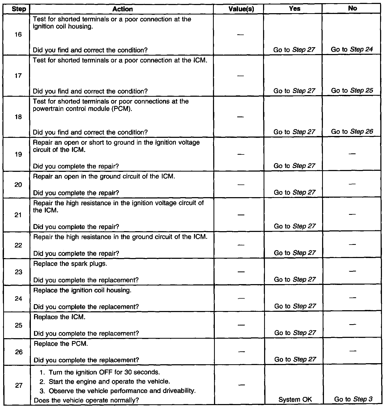 Each ignition coil supplies secondary voltage to a pair of spark plugs. This is called a waste spark ignition system. The powertrain control module (PCM) supplies a signal on each of the ignition control (IC) timing control circuits to the ignition control module (ICM). The ICM fires the correct ignition coil at the correct time based on the signals. The ICM detects if cylinder 1 or cylinder 3 is on the compression stroke by sensing the secondary voltage and polarity of each side of the ignition coil. The ICM detects this voltage with sensing circuitry integrated into each ignition coil. The higher voltage is on the compressing cylinder. This is called compression sense ignition. The ICM provides a synthesized cam signal to the PCM based on these inputs. The PCM uses the cam signal to synchronize fuel injection.