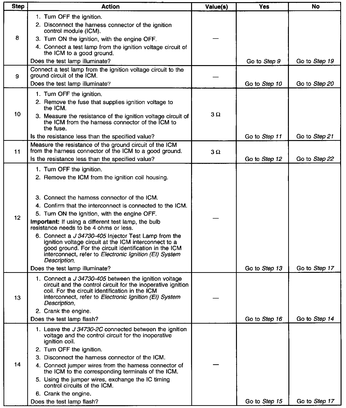 Each ignition coil supplies secondary voltage to a pair of spark plugs. This is called a waste spark ignition system. The powertrain control module (PCM) supplies a signal on each of the ignition control (IC) timing control circuits to the ignition control module (ICM). The ICM fires the correct ignition coil at the correct time based on the signals. The ICM detects if cylinder 1 or cylinder 3 is on the compression stroke by sensing the secondary voltage and polarity of each side of the ignition coil. The ICM detects this voltage with sensing circuitry integrated into each ignition coil. The higher voltage is on the compressing cylinder. This is called compression sense ignition. The ICM provides a synthesized cam signal to the PCM based on these inputs. The PCM uses the cam signal to synchronize fuel injection.