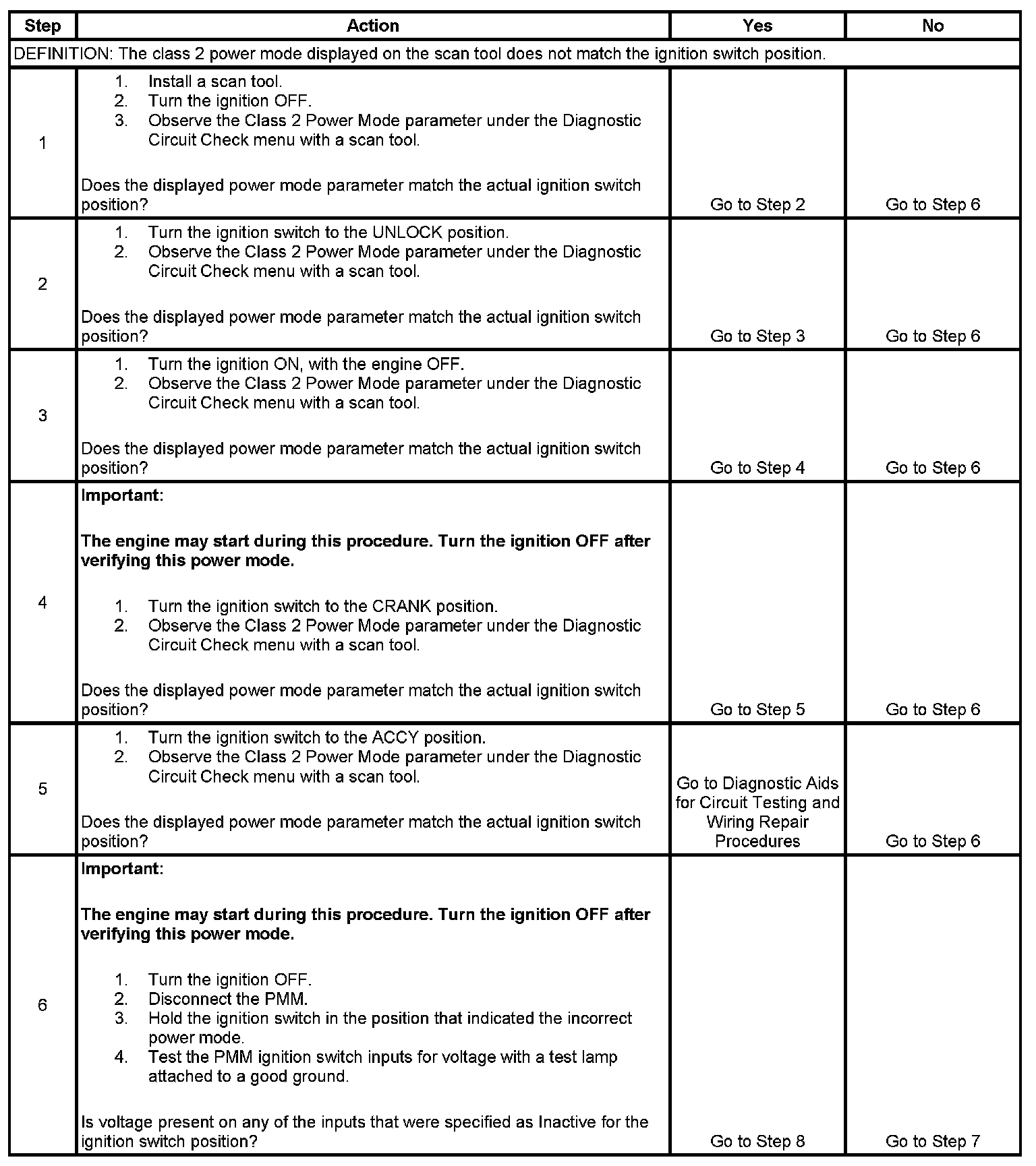 Normal vehicle class 2 communications and module operations will not begin until the system power mode has been identified. Discrete circuits from the ignition switch are monitored by the power mode master (PMM) module in order to determine the correct power mode. The PMM communicates the system power mode to all class 2 modules on the class 2 serial data line. The body control module (BCM) is the PMM on this vehicle. Use this table if the class 2 power mode does not match the ignition switch position.