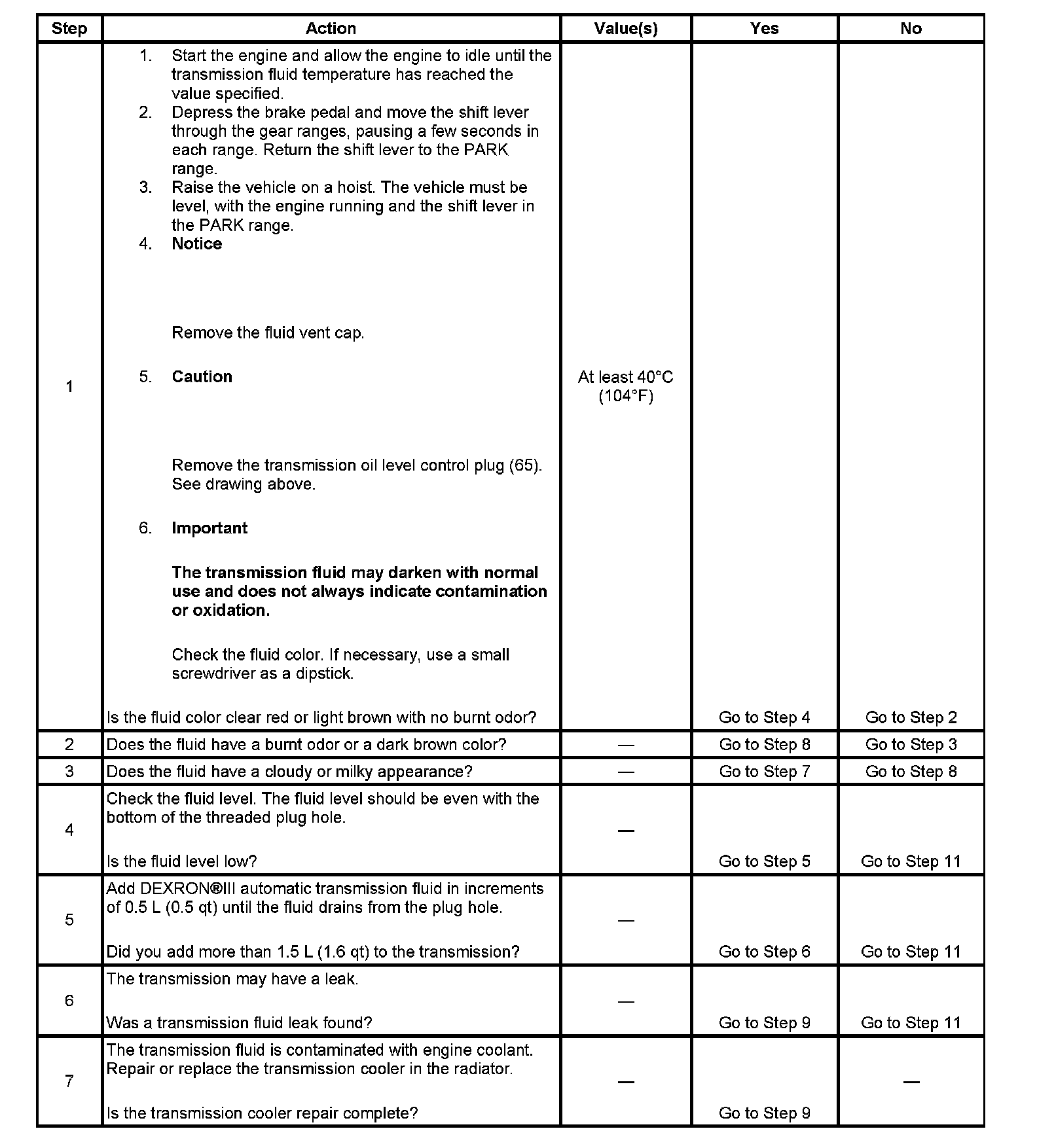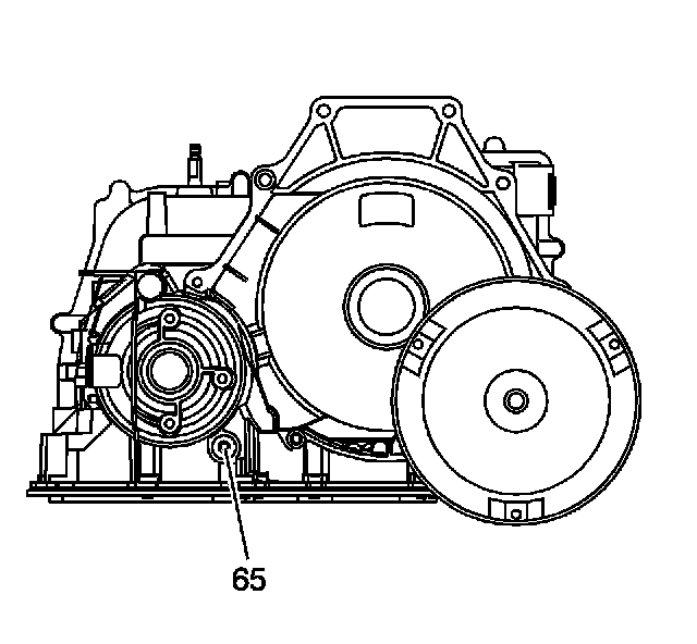 The oil level control plug (65) is located on the torque converter side of the transmission.