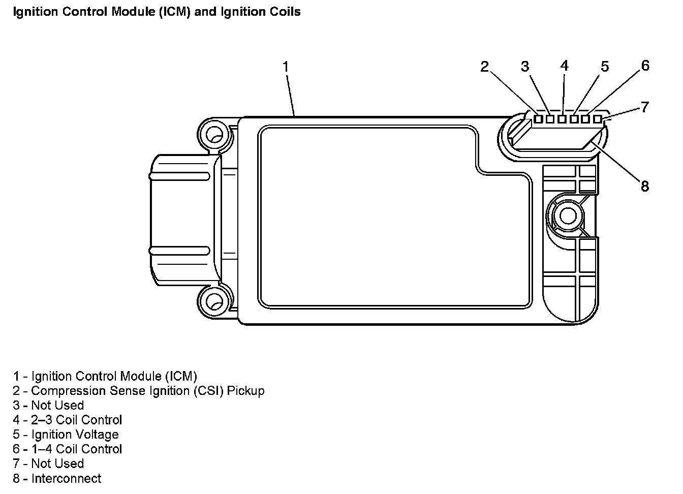 The powertrain control module (PCM) supplies a signal on each of the ignition control (IC) timing control circuits to the ignition control module (ICM). The ICM fires the correct ignition coil at the correct time based on the signals. The ICM detects if cylinder 1 or cylinder 3 is on the compression stroke by sensing the secondary voltage and polarity of each side of the ignition coil. The ICM detects this voltage with sensing circuitry integrated into each ignition coil. The higher voltage is on the compressing cylinder. This is called compression sense ignition. The ICM provides a synthesized cam signal to the PCM based on these inputs. The PCM uses the cam signal to synchronize fuel injection.