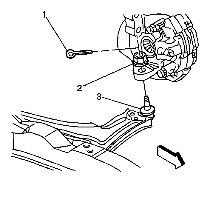5. Remove the cotter pin (1) and the nut (2) from the ball joint stud (3).