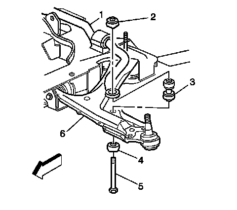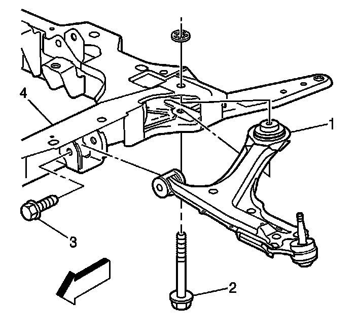 1. Install the control arm (1) into position and install the bolt (2) attaching the control arm (1) to the crossmember (4).Hand tighten the bolt.