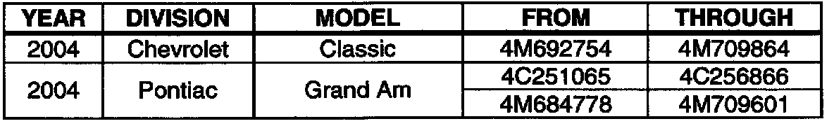 Involved are certain 2004 model year Chevrolet Classic and Pontiac Grand Am vehicles built within the VIN breakpoints shown.