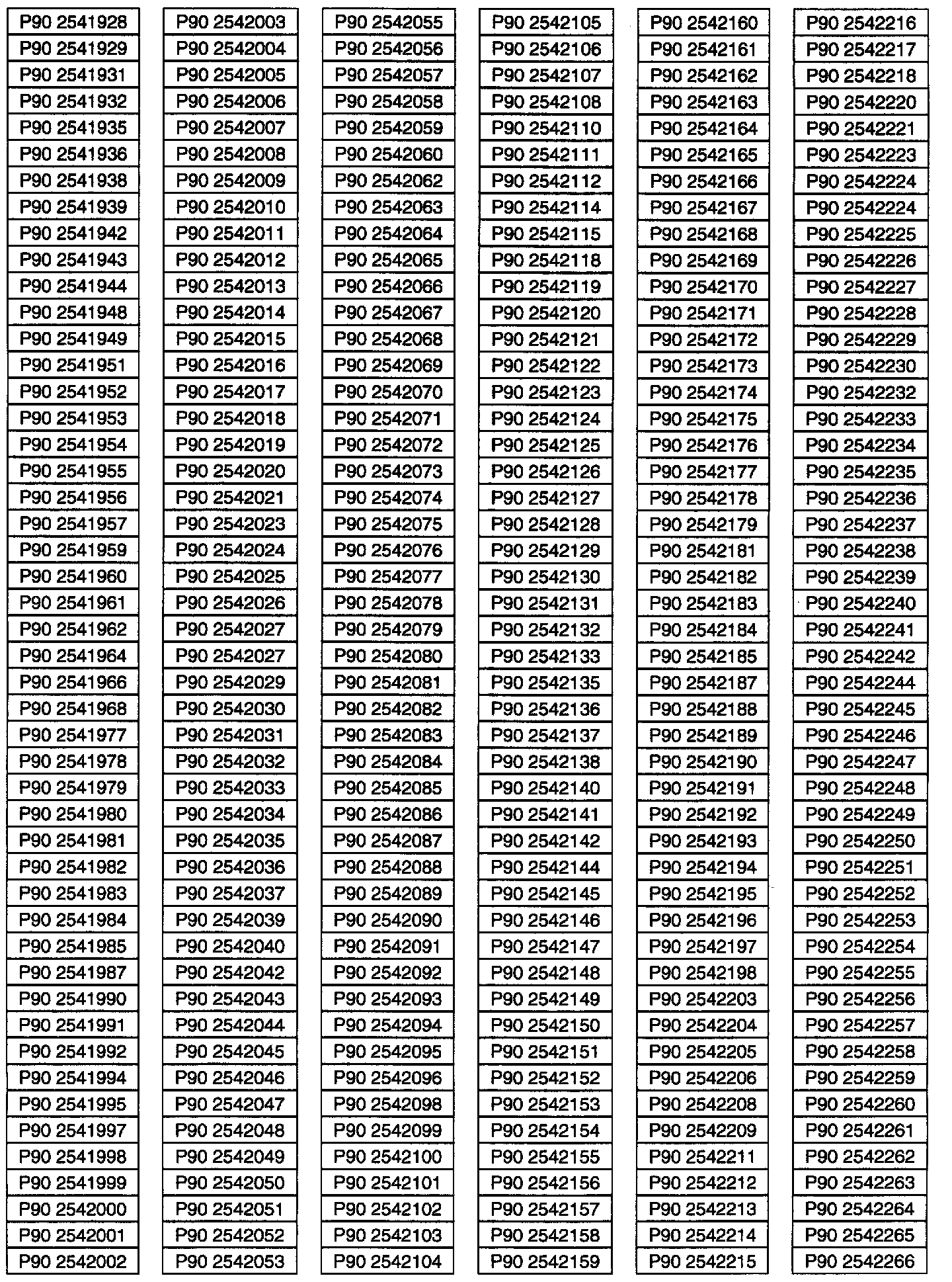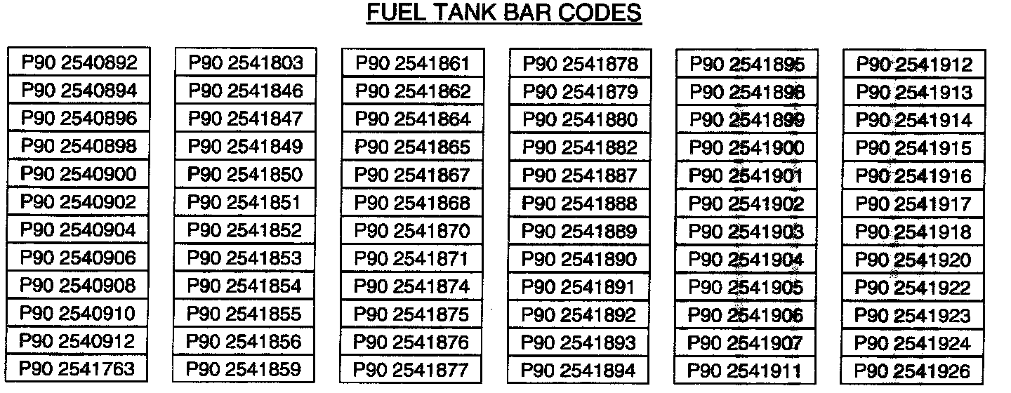 ^ If the bar code number on the label does NOT match any of those shown, then the fuel tank does NOT need to be replaced. Proceed to Step 13 in the FUEL TANK REPLACEMENT procedure to reinstall the tank.