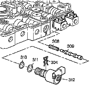 2. Remove the Pressure Control Solenoid (PCS) retainer clip (304), the PCS with two O-rings and screen (312, 309, 310), the torque signal regulator valve (309), and the torque signal regulator spring (308).