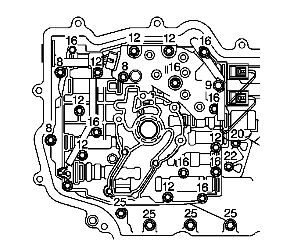 6. Remove the remaining control valve body bolts (9, 12, 16) and remove the control valve body assembly (18).