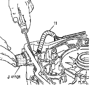 3. Push the J 41101 onto the pass-through connector from the outside of the transmission case in order to compress the pass-through connector's retaining tabs.
