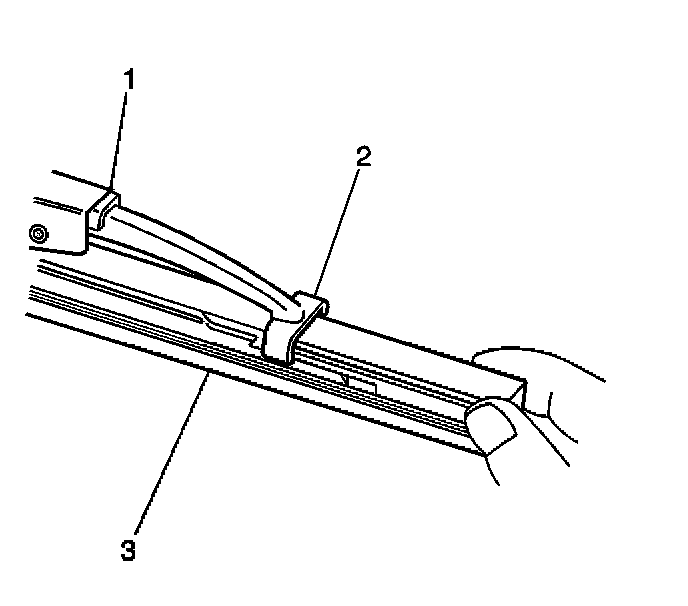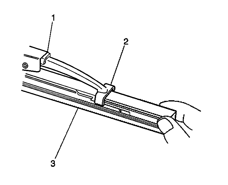 3. Engage the bottom claw (2) of the wiper blade (1) into the notches in wiper blade element (3).