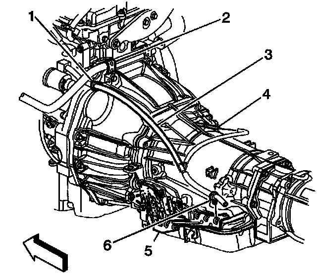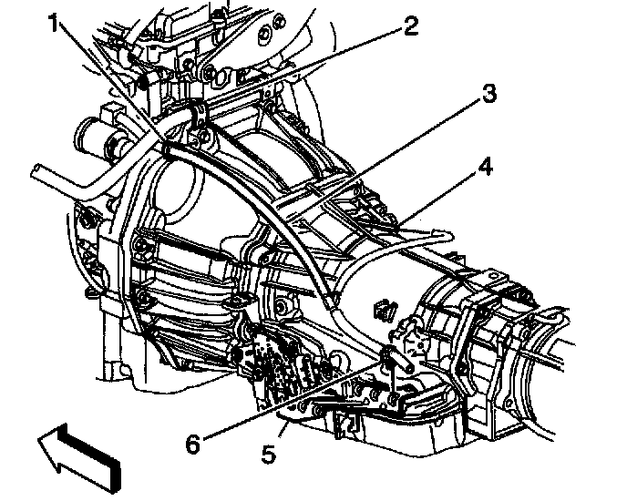 2. Connect the transmission vent hose retainer (1, 6) to the following:
