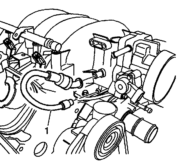 11. If equipped with the RPO LS6 engine, install the PCV valve hose (1) to the valley cover and intake manifold.