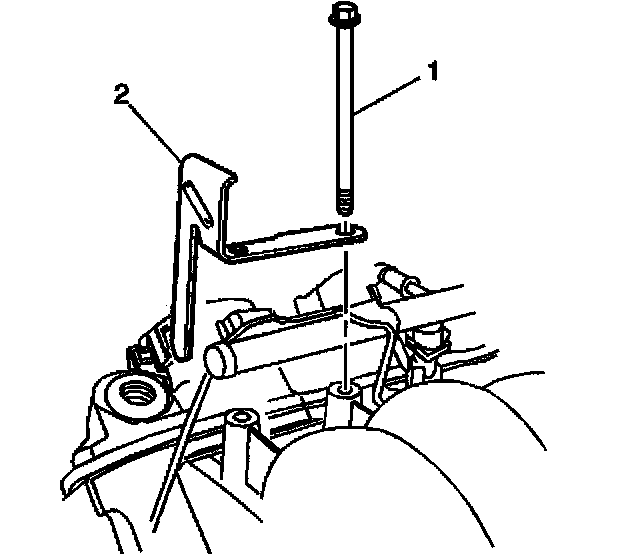 31. Remove the intake manifold bolts (1) and fuel rail stop bracket (2).