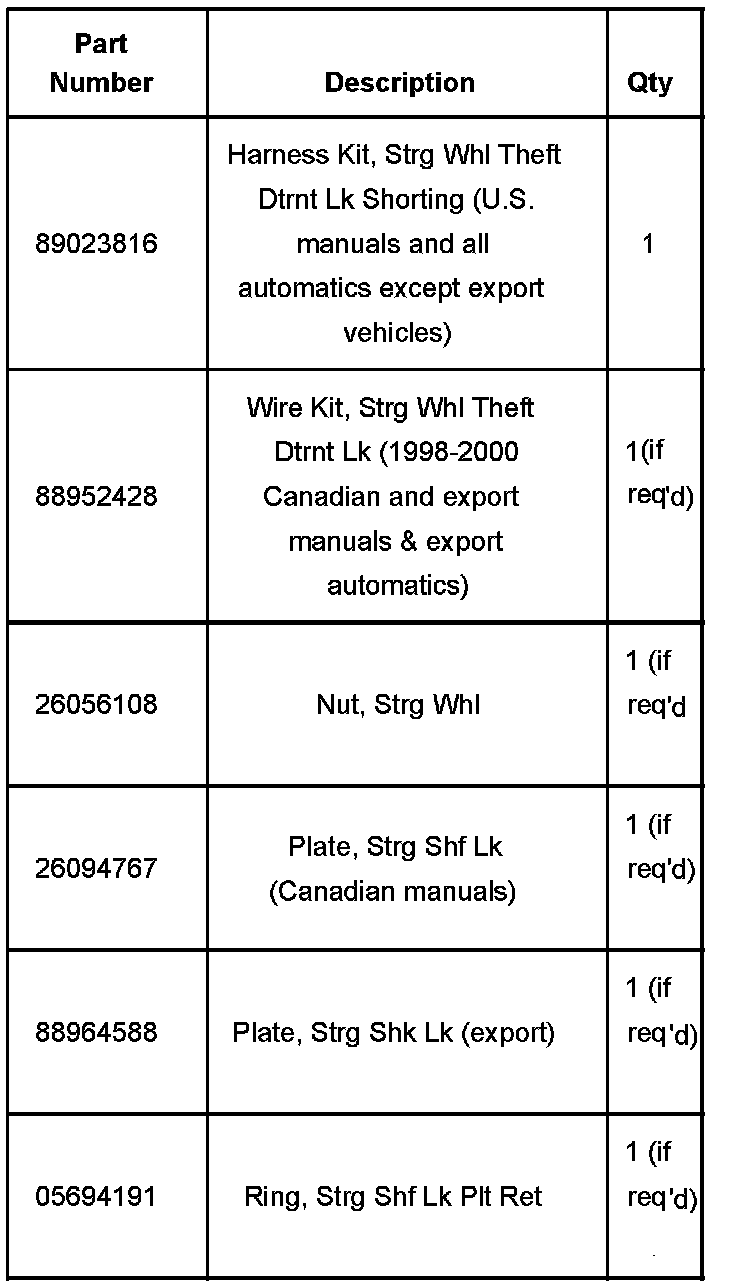 Parts required to complete this recall are to be obtained from General Motors Service Parts Operations (GMSPO). Please refer to your "involved vehicles listing" before ordering parts. Normal orders should be placed on a DRO = Daily Replenishment Order. In an emergency situation, parts should be ordered on a CSO = Customer Special Order.