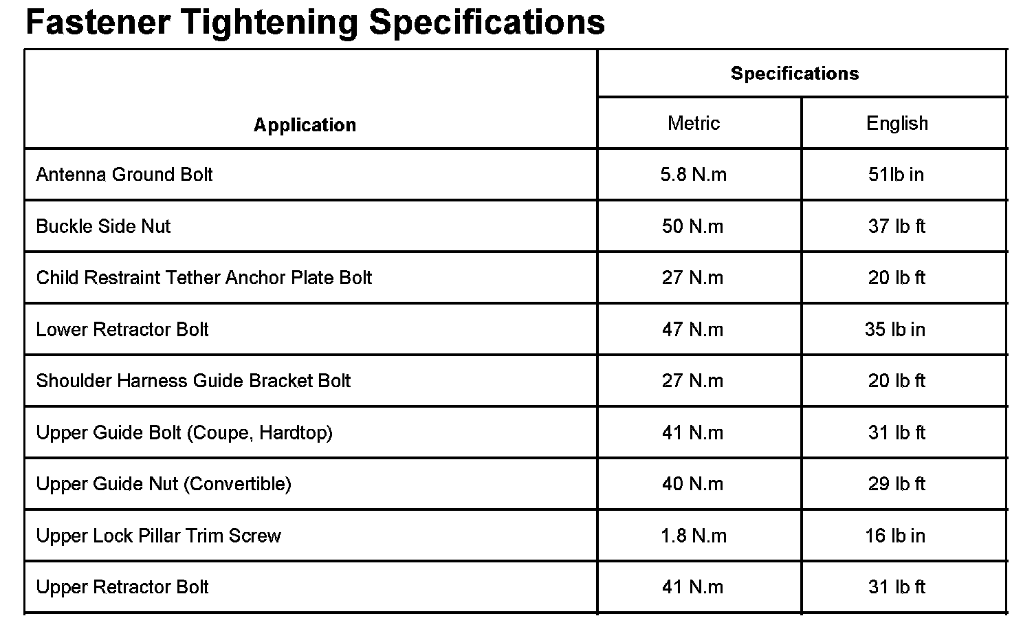 Fastener Tightening Specifications: