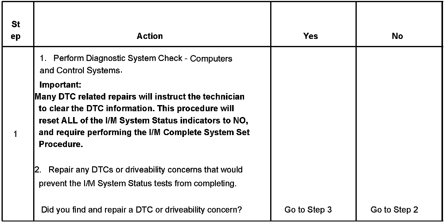 For the specific DTCs required for each system, refer to Inspection/Maintenance (I/M) System DTC Table. Systems such as fuel delivery, misfire, and comprehensive components may not be listed in a system status list. These tests run continuously and do not require an I/M System Status indicator. Inspection/Maitenance (I/M) System (DTC) Table