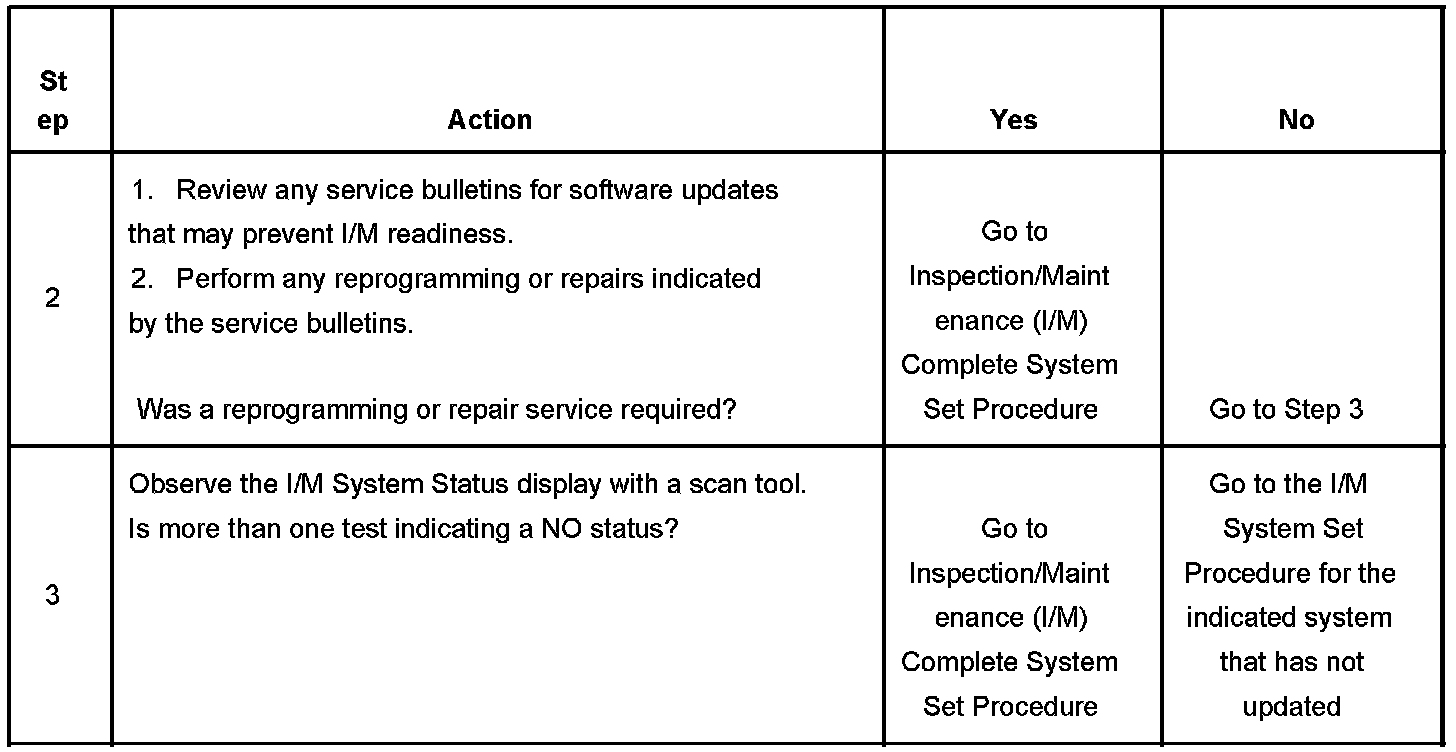 For example, when the HO2S Heater Status indicates YES, either all of the oxygen sensor heater tests have passed or one of the tests has illuminated the MIL. If the vehicle has four heated oxygen sensors, either all four heater circuit tests have passed or one of the heater circuit tests has illuminated the MIL. The I/M System Status will indicate NO under the Completed column when any of the required tests for that system have not run. The following is a list of conditions that would set the I/M System Status indicator to NO: