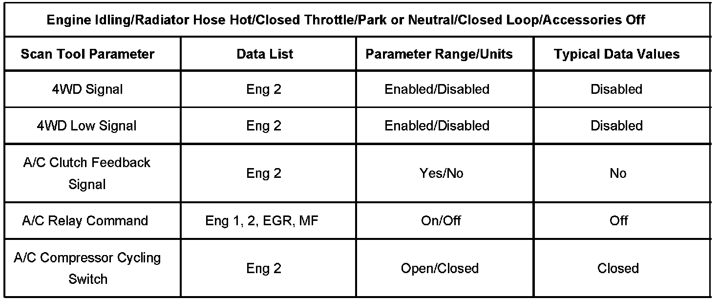 Scan tool values from a properly running engine may be used for comparison with the engine you are diagnosing. The Engine Scan Tool Data List represents values that would be seen on a normal running engine.
