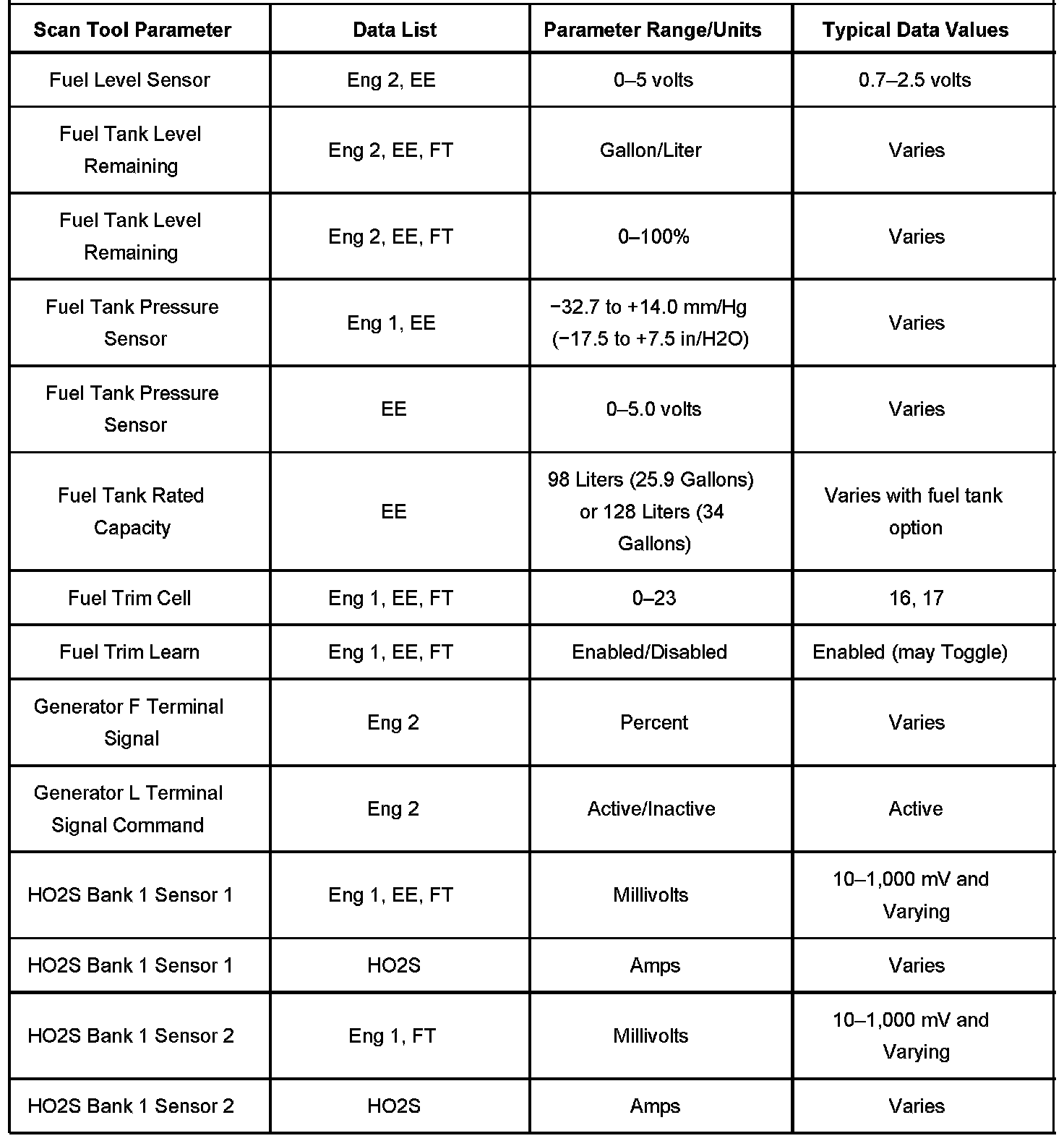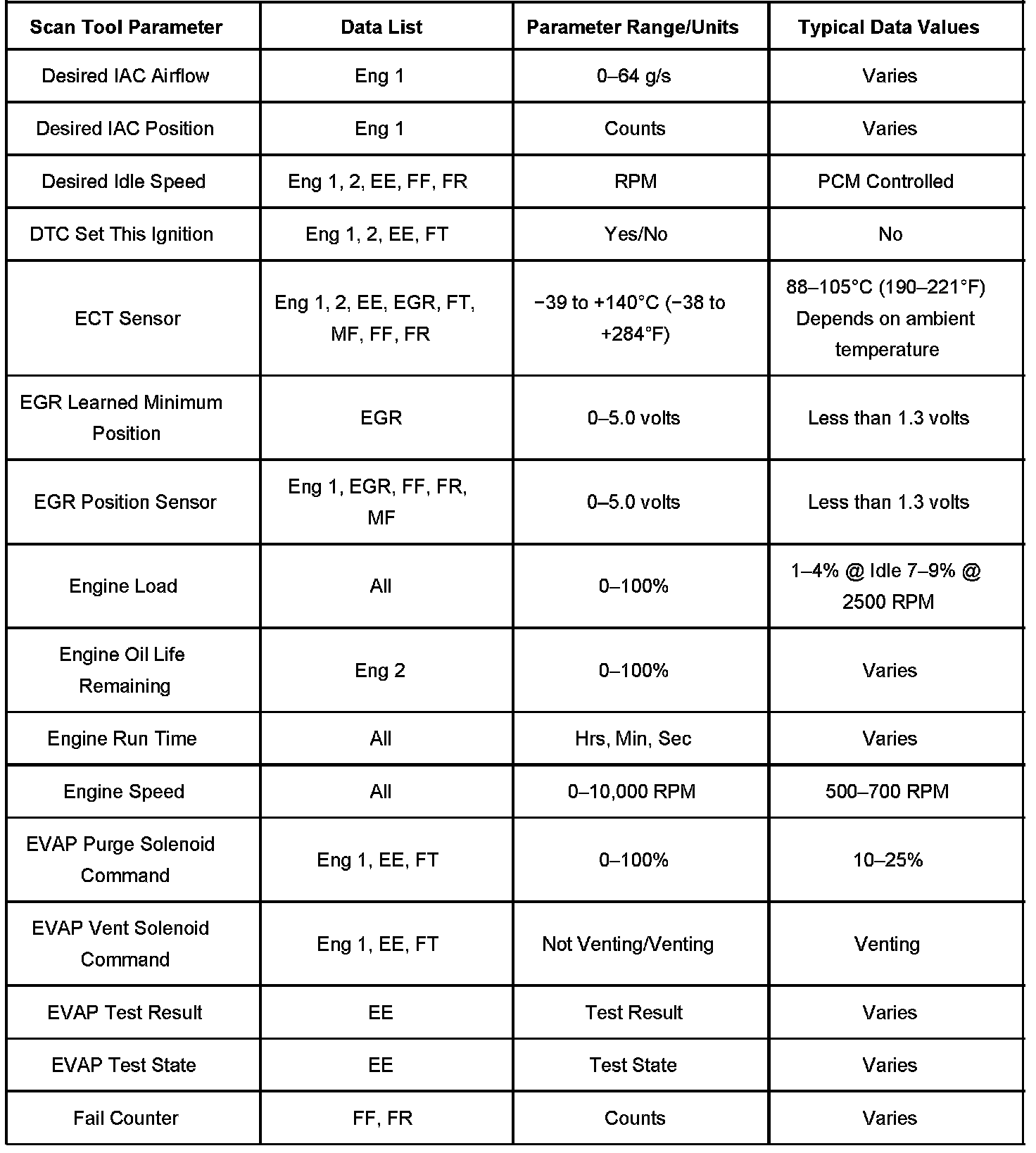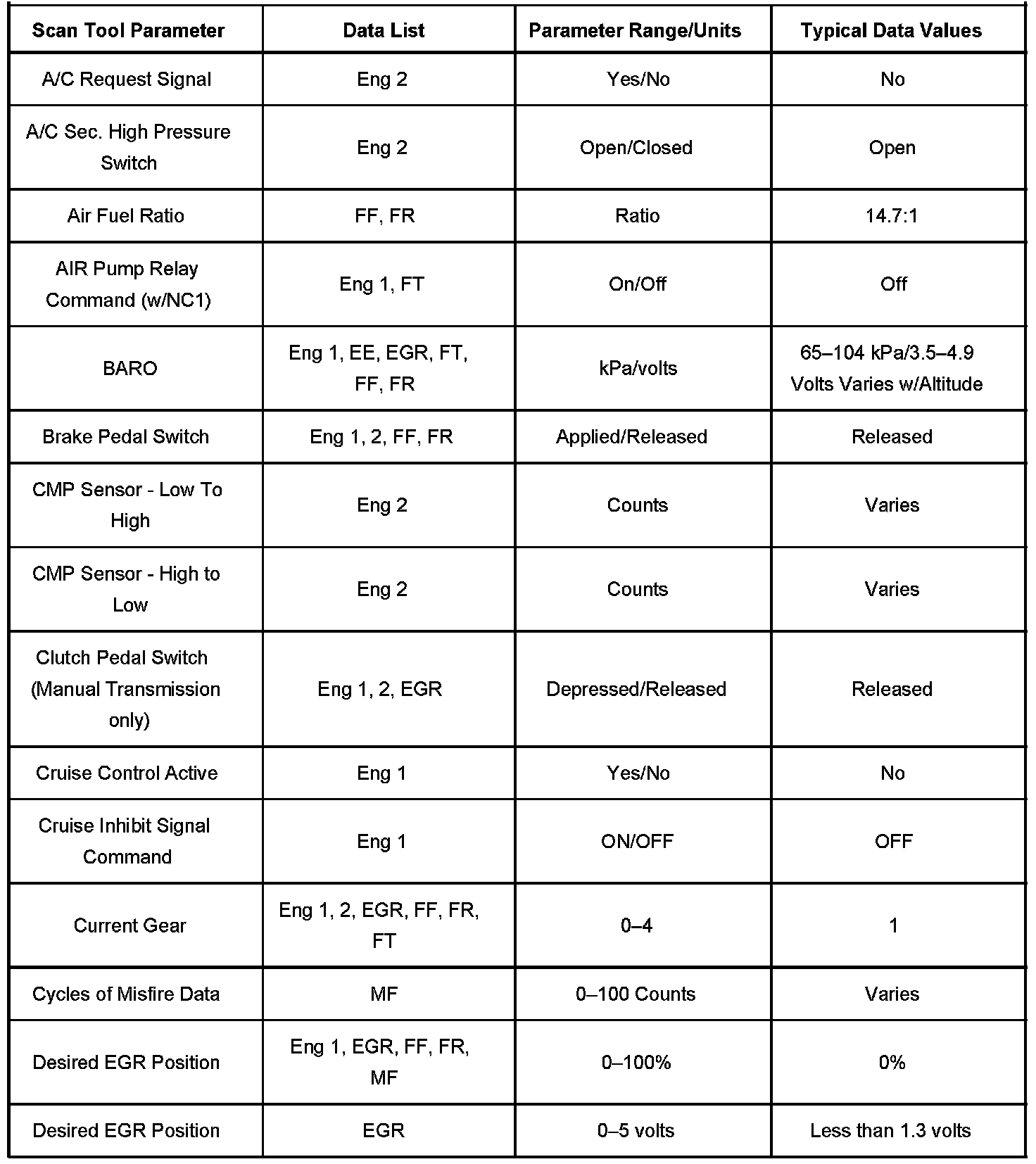 The Engine Scan Tool Data List contains all engine related parameters that are available on the scan tool. The list is arranged in alphabetical order. A given parameter may appear in any one of the data lists, and in some cases may appear more than once, or in more than one data list in order to group certain related parameters together.