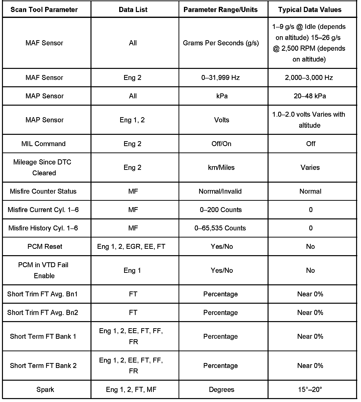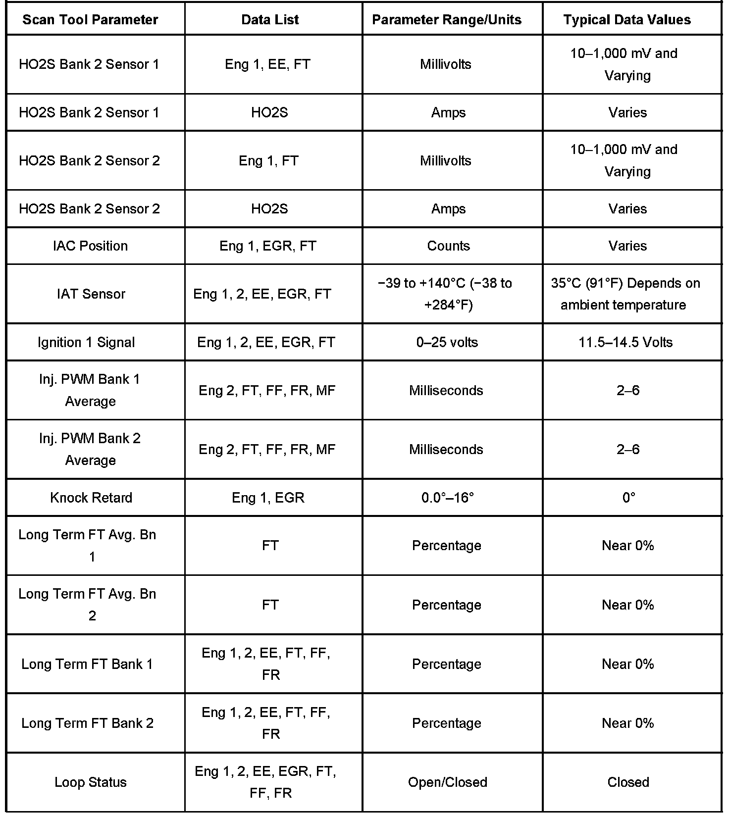 The column labeled Data List indicates where a parameter can be located on the scan tool. Refer to the scan tool operating manual for the exact locations of the data lists. The following is a description of each term listed: