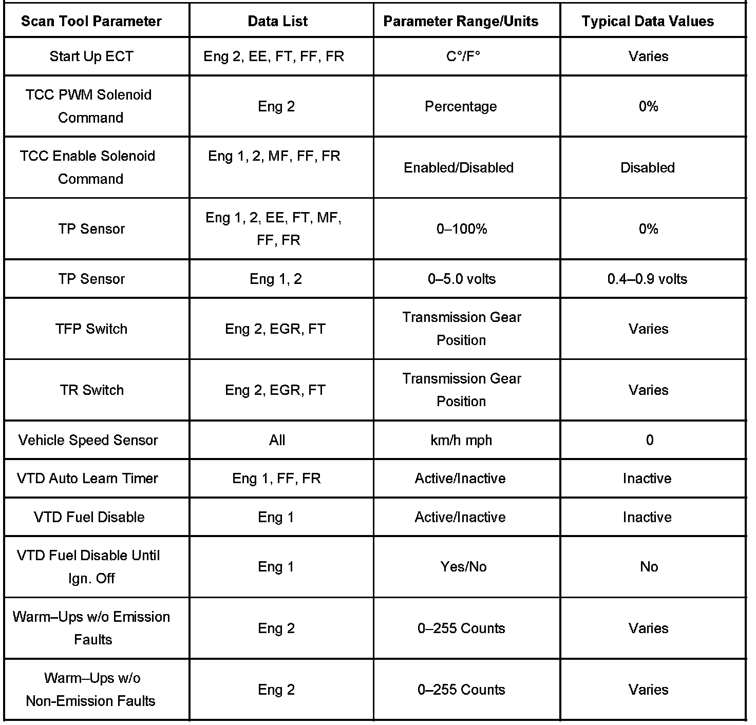 Only the parameters listed are referenced for use in diagnosis. If all values are within the typical range described below, refer to Symptoms - Computers and Control Systems for diagnosis. Symptom Related Diagnostic Procedures
