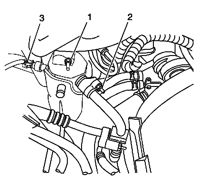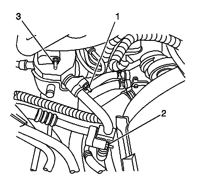 4. Remove the evaporator outlet hose retaining nut (3) from the accumulator.