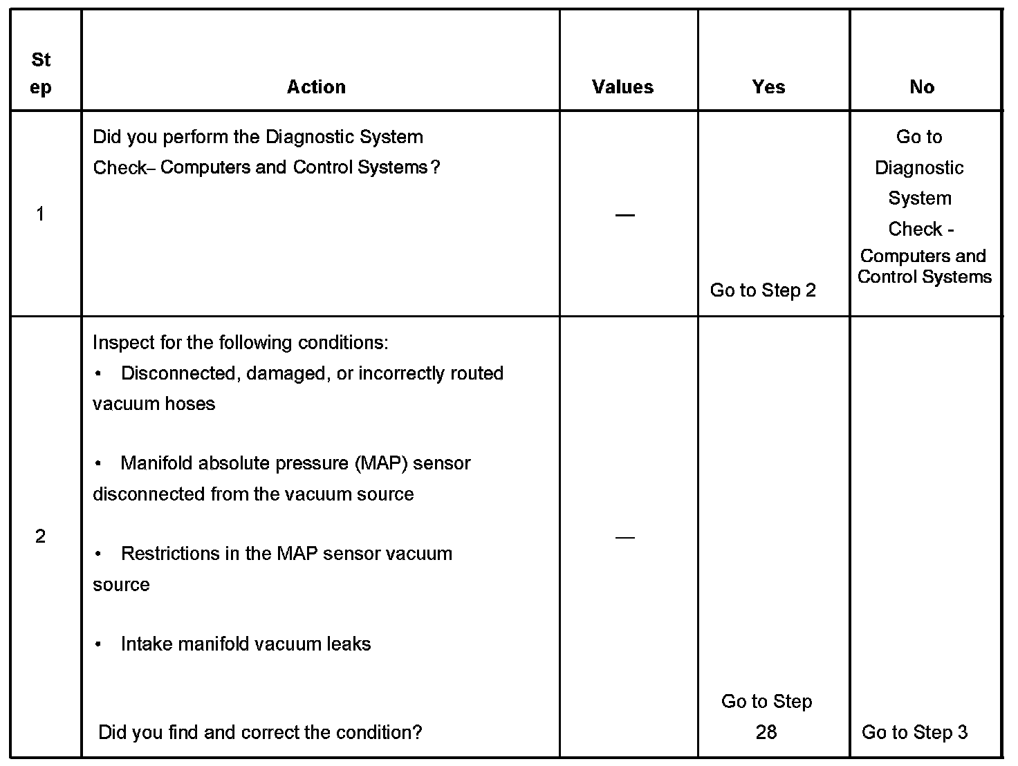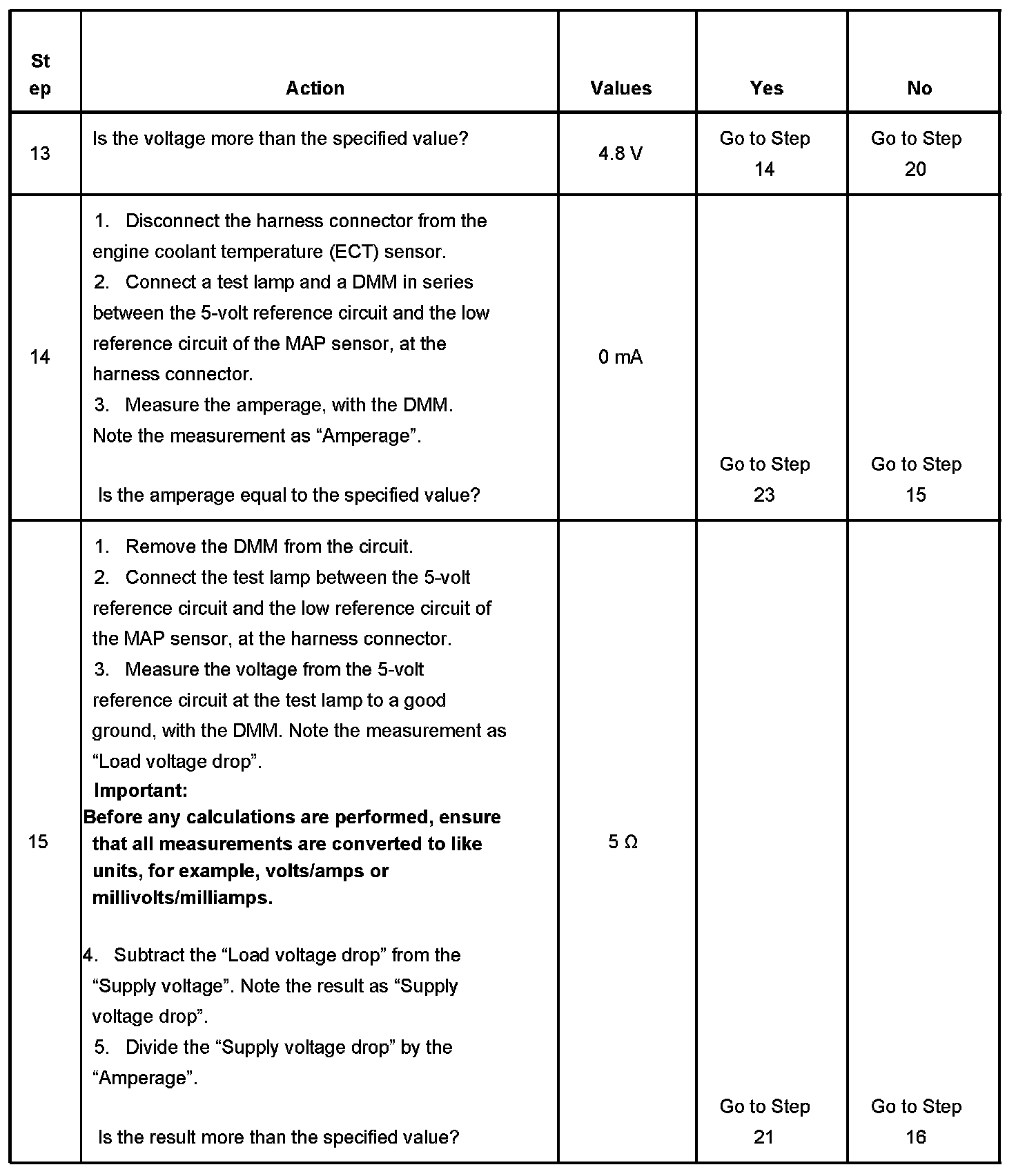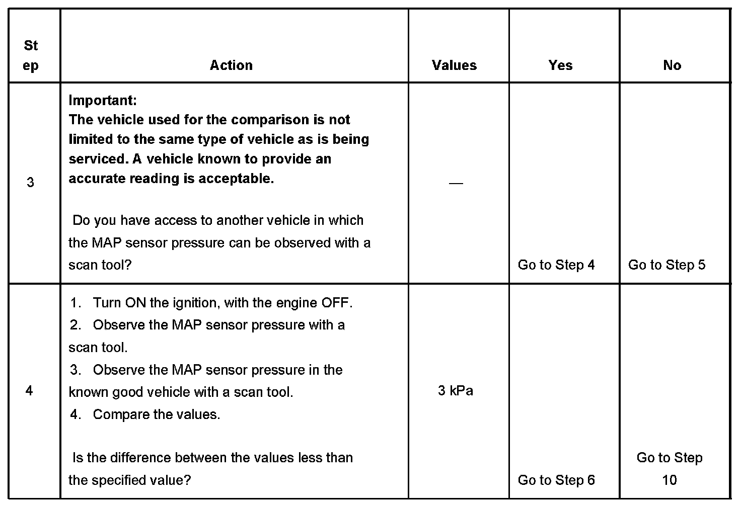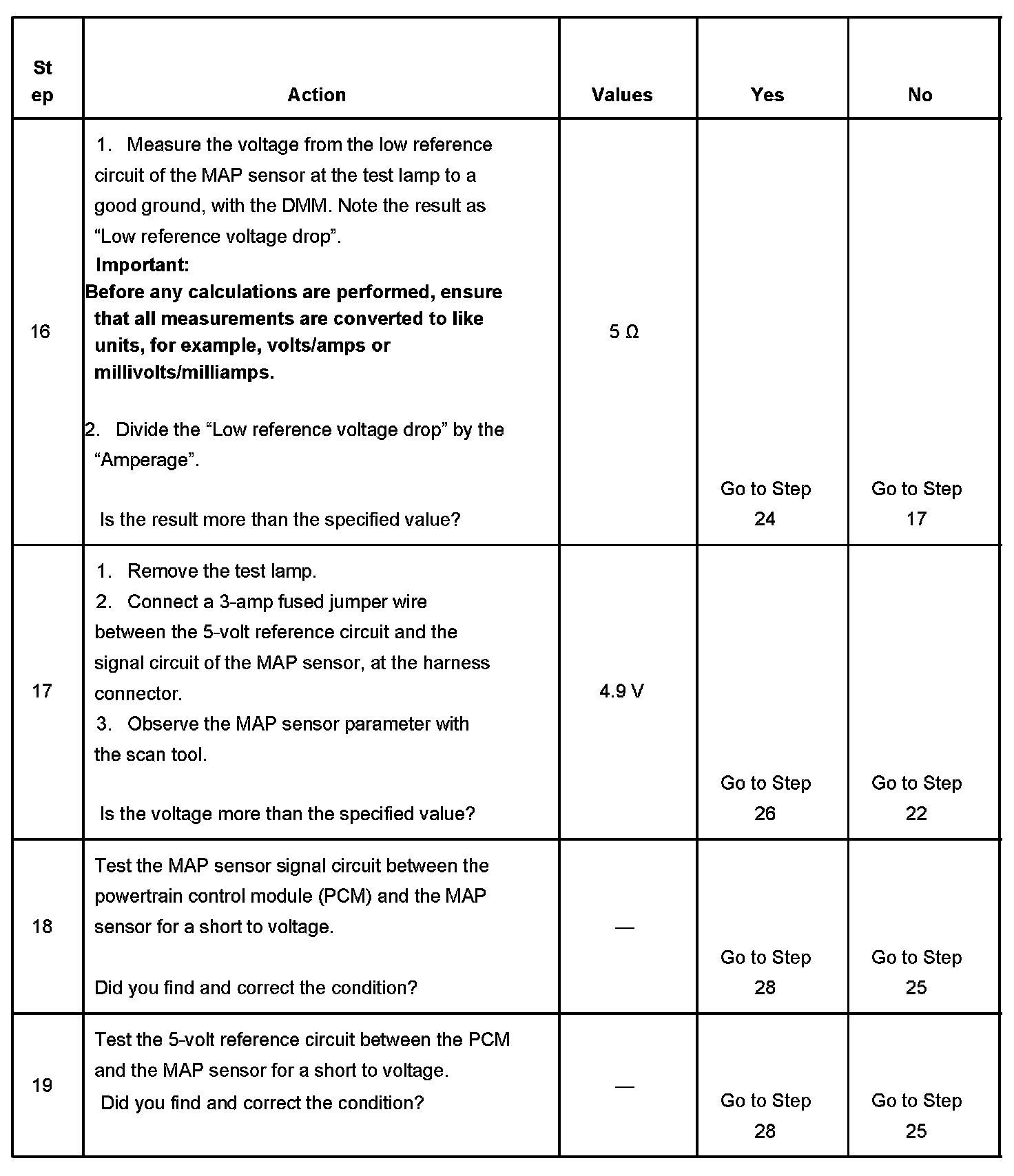 The manifold absolute pressure (MAP) sensor responds to changes in intake manifold pressure which gives an indication of the engine load. The MAP sensor has a 5-volt reference circuit, a low reference circuit, and a signal circuit. The powertrain control module (PCM) supplies 5 volts to the MAP sensor on the 5-volt reference circuit and provides a ground on the low reference circuit. The MAP sensor provides a signal to the PCM on the MAP sensor signal circuit, which is relative to the pressure changes in the manifold. With low MAP, such as during idle or deceleration, the PCM should detect a low MAP sensor signal voltage. With high MAP, such as ignition ON, engine OFF or wide open throttle (WOT), the PCM should detect a high MAP sensor signal voltage. The MAP sensor is also used in order to calculate the barometric pressure (BARO) when the ignition switch is turned ON, with the engine OFF. The BARO reading may also be updated whenever the engine is operated at WOT. The PCM monitors the MAP sensor signal for voltage outside of the normal range. If the PCM detects a MAP sensor signal voltage that is excessively low, DTC P0107 sets. If the PCM detects a MAP sensor signal voltage that is excessively high DTC P0108 sets.
