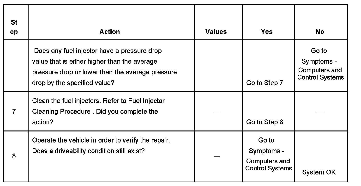 6. If the pressure drop value for each fuel injector is within 10 kPa (1.5 psi) of the average pressure drop value, the fuel injectors are flowing properly.