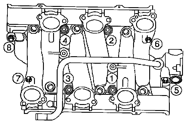 Tighten the lower intake manifold bolts (5, 6, 7, 8) in sequence to 25 Nm (18 lb ft) on the final pass.