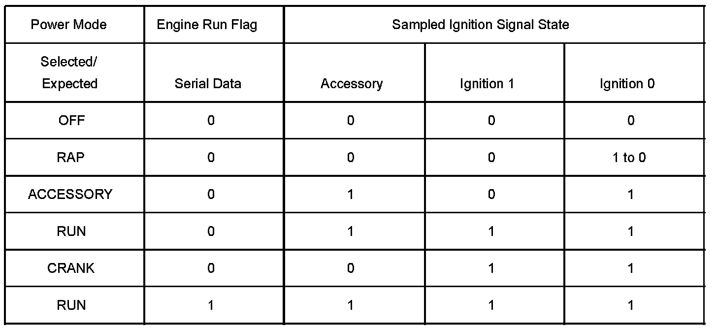 The modules that depend exclusively on serial data messages for power modes stay in the state dictated by the last valid BCM message until they can check for the engine run flag status on the serial data circuits. If the BCM fails, the modules monitor the serial data circuit for the engine run flag serial data. If the engine run flag serial data is True, indicating that the engine is running, the modules fail-safe to RUN. In this state the modules and their subsystems can support all operator requirements. If the engine run flag serial data is False, indicating that the engine is not running, the modules fail-safe to OFF-AWAKE. In this state the modules are constantly checking for a change status message on the serial data circuits and can respond to both local inputs and serial data inputs from other modules on the vehicle.