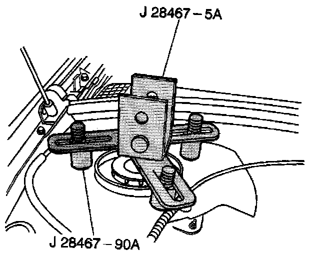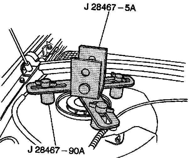 6. Install the strut tower support assemblies J 28467-5A over the J 28467-9OA.