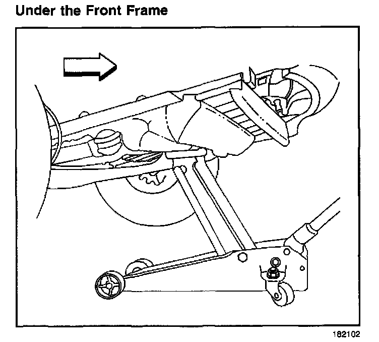 When lifting the front of the vehicle with a floor jack, place the floor jack lift pad at the center of the front frame.