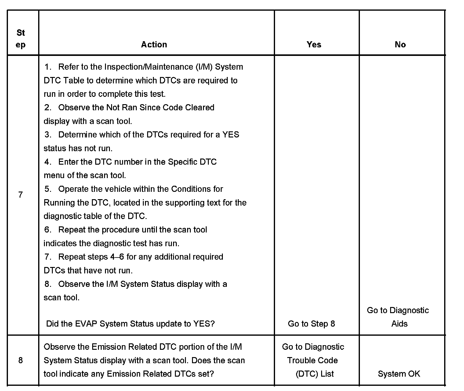 The purpose of this test is to satisfy the enable criteria necessary to execute inspection/maintenance (I/M) readiness diagnostics for the evaporative emission (EVAP) system. The test may be used to set the I/M System Status indicators to YES. The I/M System Status display on the scan tool indicates whether or not the control module has completed the required test. The required test is complete when either all of the DTCs comprising the test have run and passed, or when any one of the DTCs comprising the test has illuminated the malfunction indicator lamp (MIL). Once the test is complete, the I/M System Status display will indicate YES in the completed column. Performing a visual inspection prior to running the EVAP test may prevent having to repeat the test due to the fact that a failed or aborted test will require the vehicle to cool down in order to meet the enable criteria to run another test.