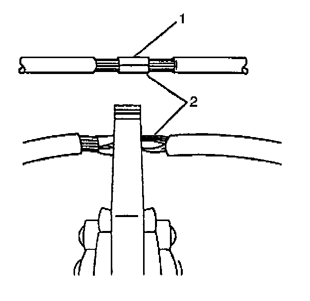 7. Center the splice clip (2) over the stripped wires (1) and hold the clip in place.
