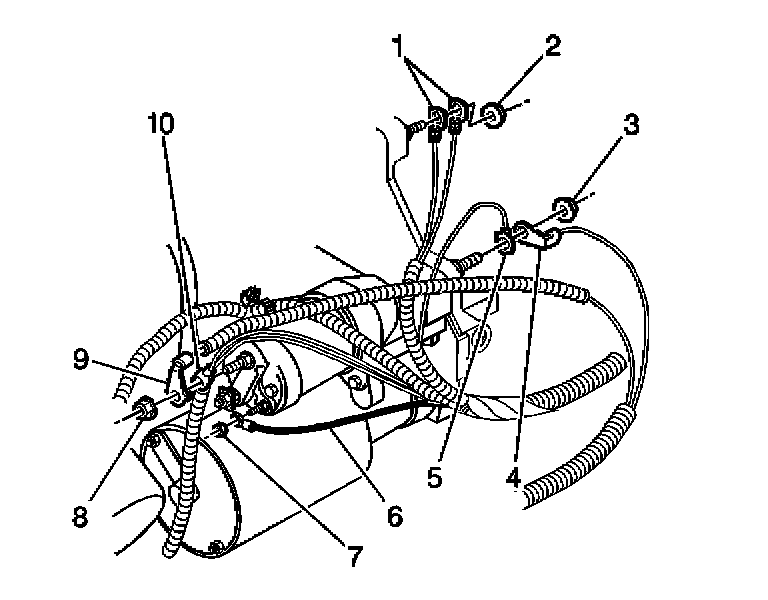 10. Remove the positive battery cable nut (8) from the starter motor BAT terminal.