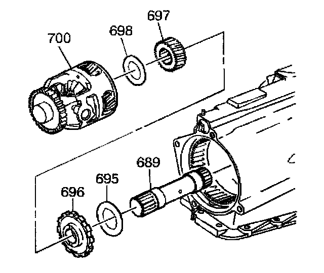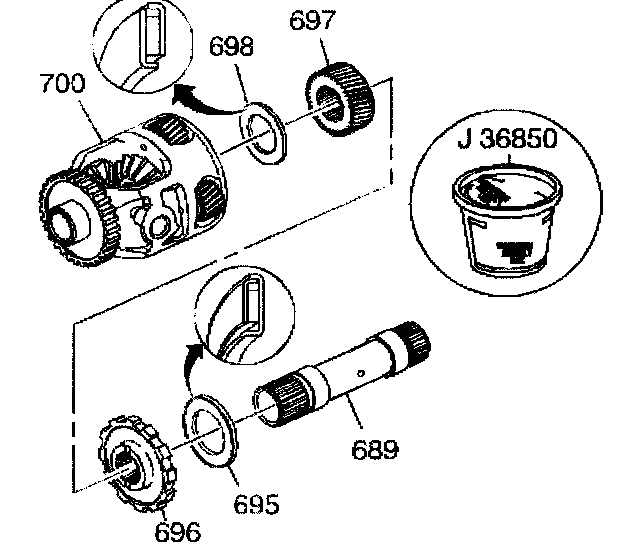 1. Assemble the sun gear thrust bearing (698), the differential carrier sun gear (697), the park gear (696), the internal gear thrust bearing (695) and the sun gear shaft (689) into the differential carrier (700).