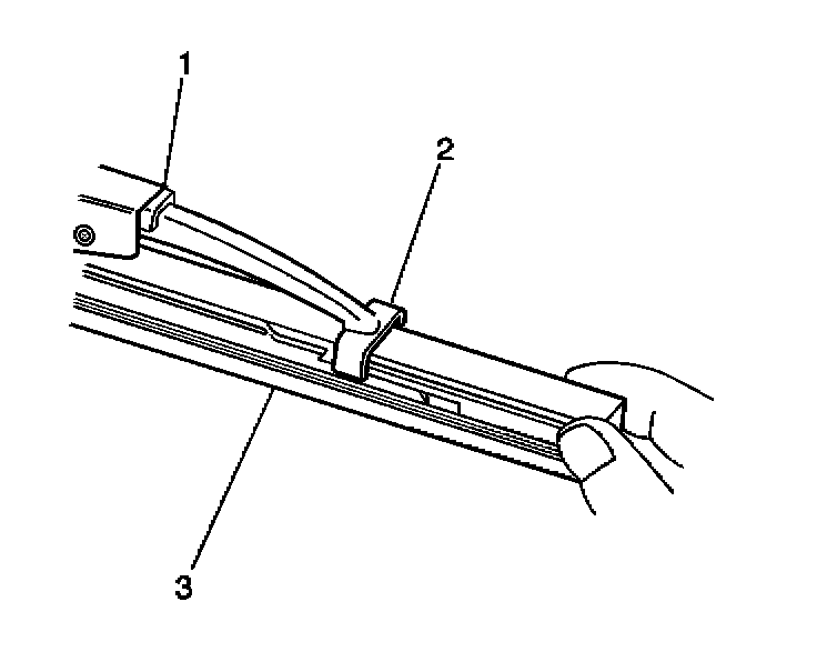 3. Engage the bottom claw (2) of the wiper blade (1) into the notches in wiper blade element (3).