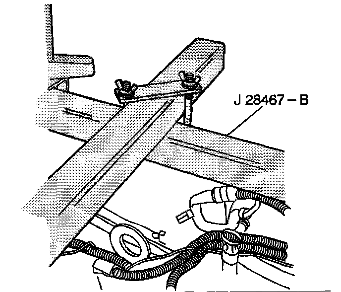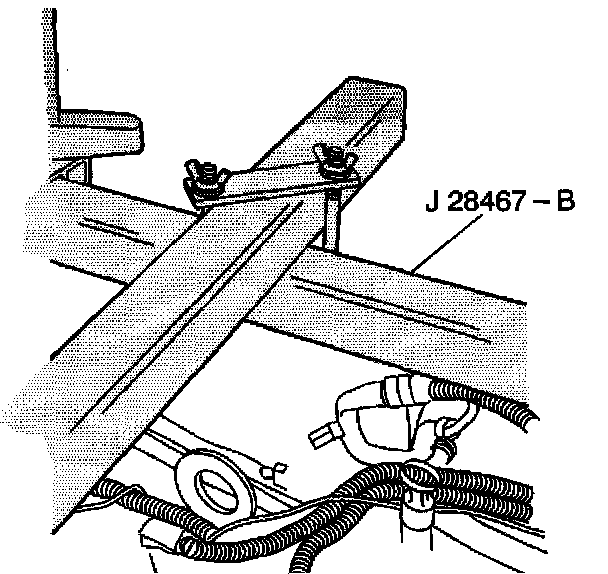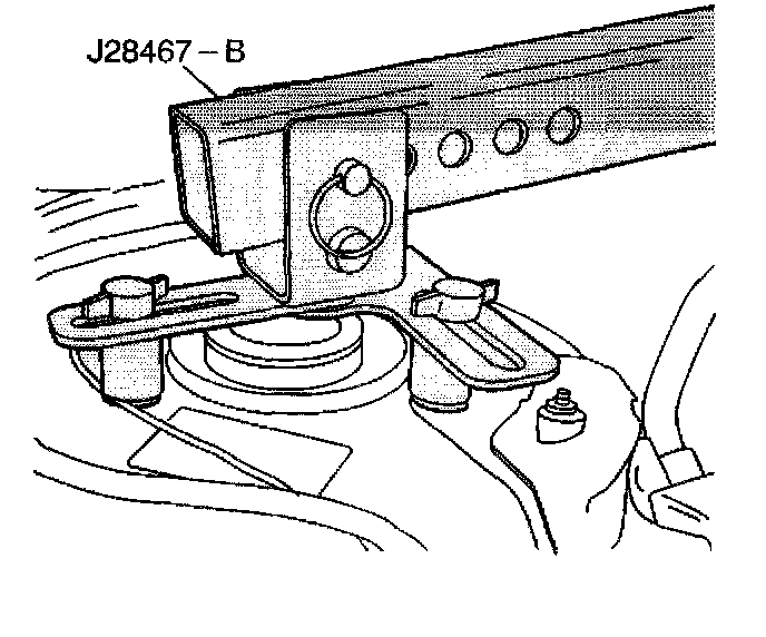 17. Place the rubber padded foot of the front support assembly (J 28467-4A) on the vehicle radiator shelf. The foot position used in the front support assembly (J 28467-4A) depends on the vehicle application.