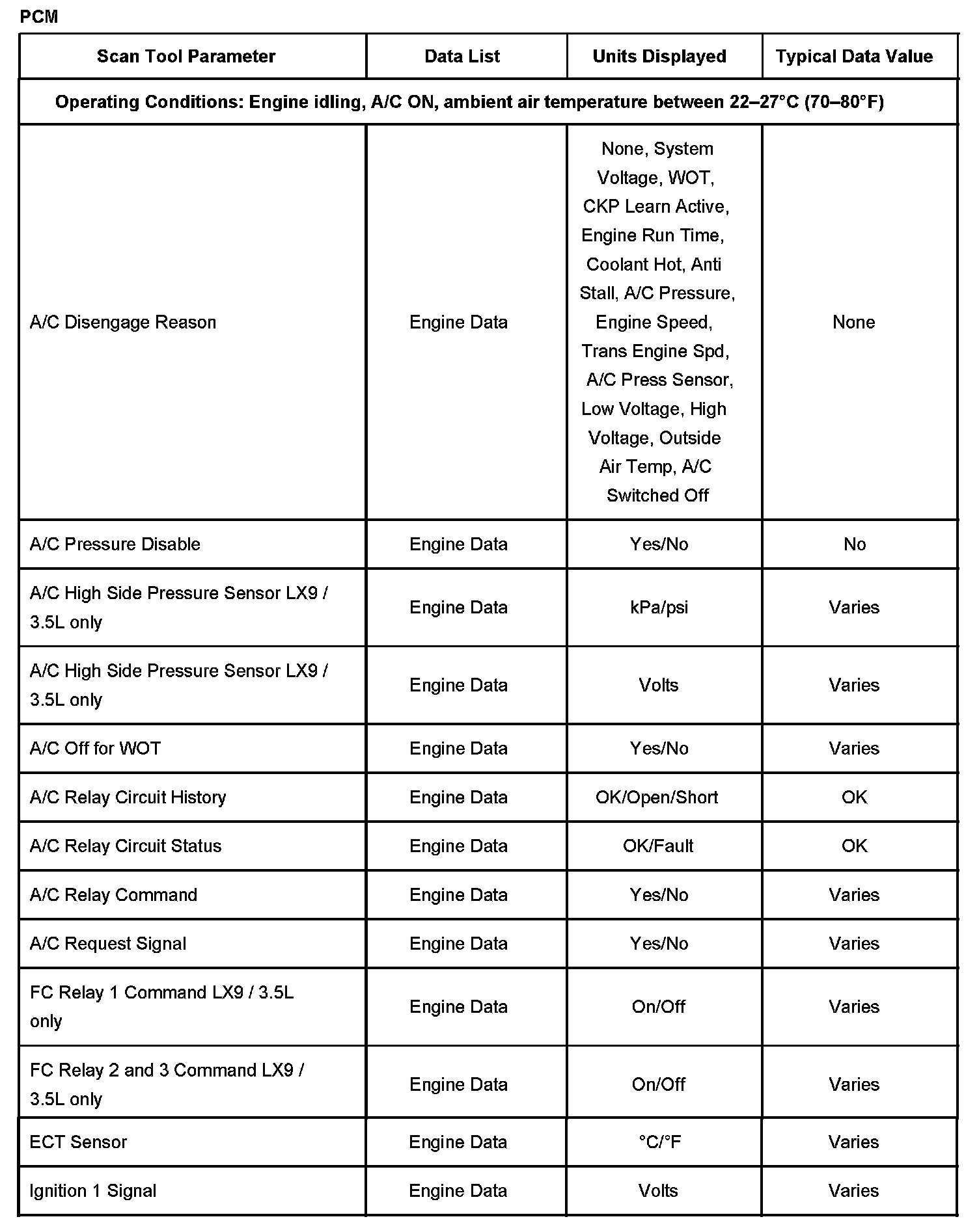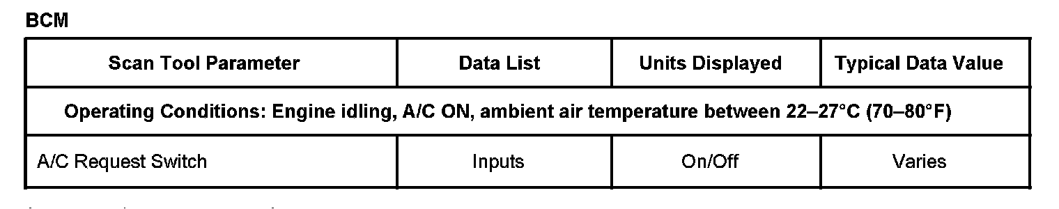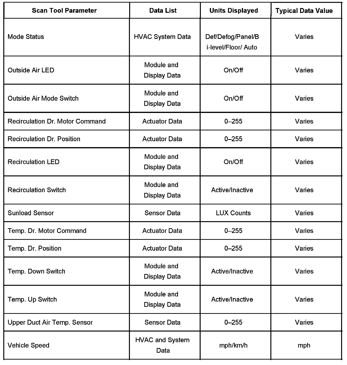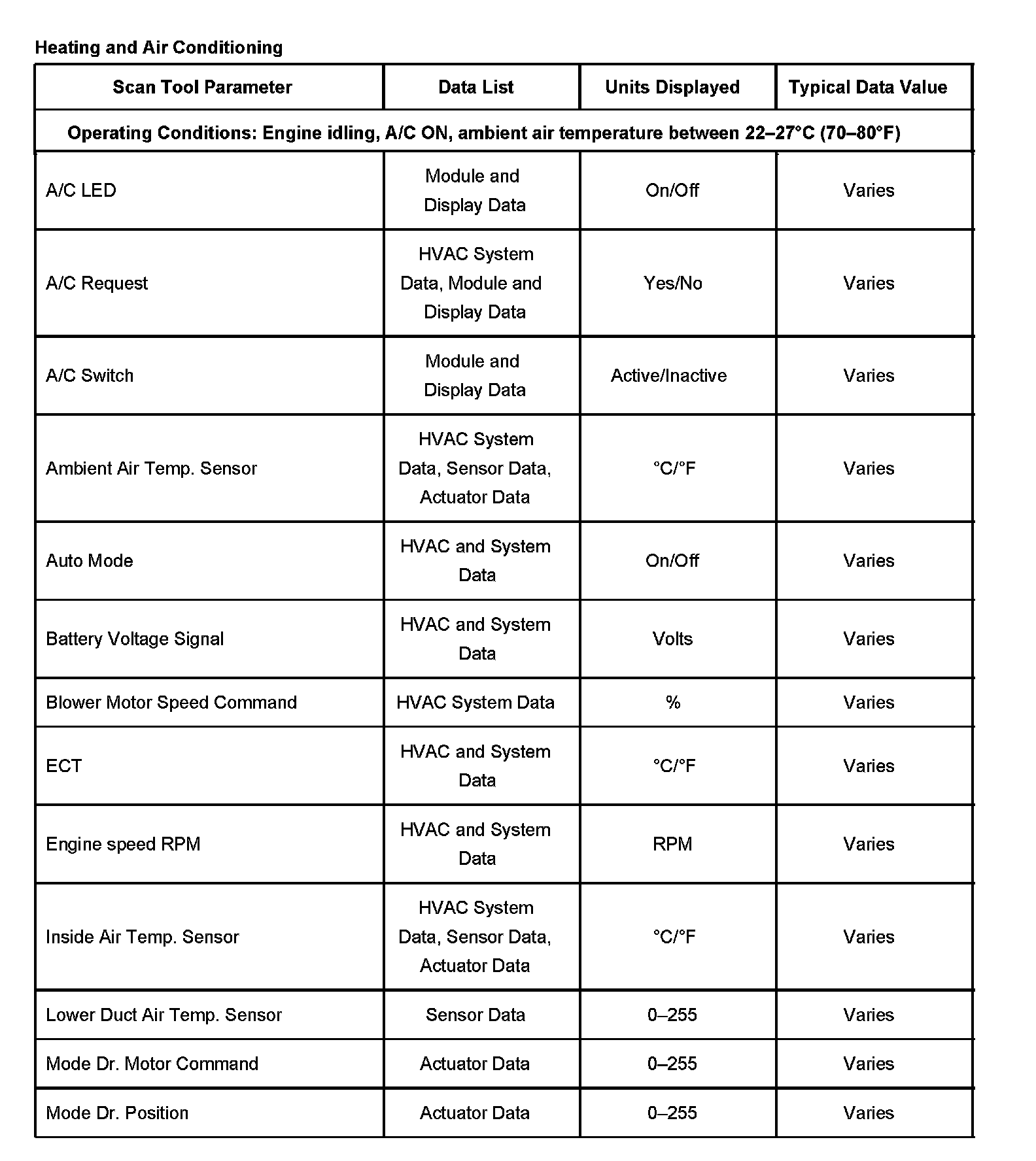 Use the Scan Tool Data Display Values and Definitions in order to assist in diagnosing the HVAC control module concerns. Compare the vehicles actual scan tool data with the typical data display value table information. Use the data information in order to aid in understanding the nature of the concern when the vehicle does not match with the typical data display values.