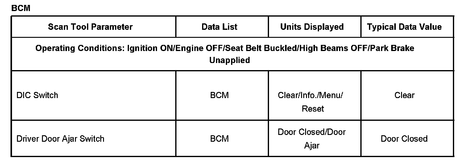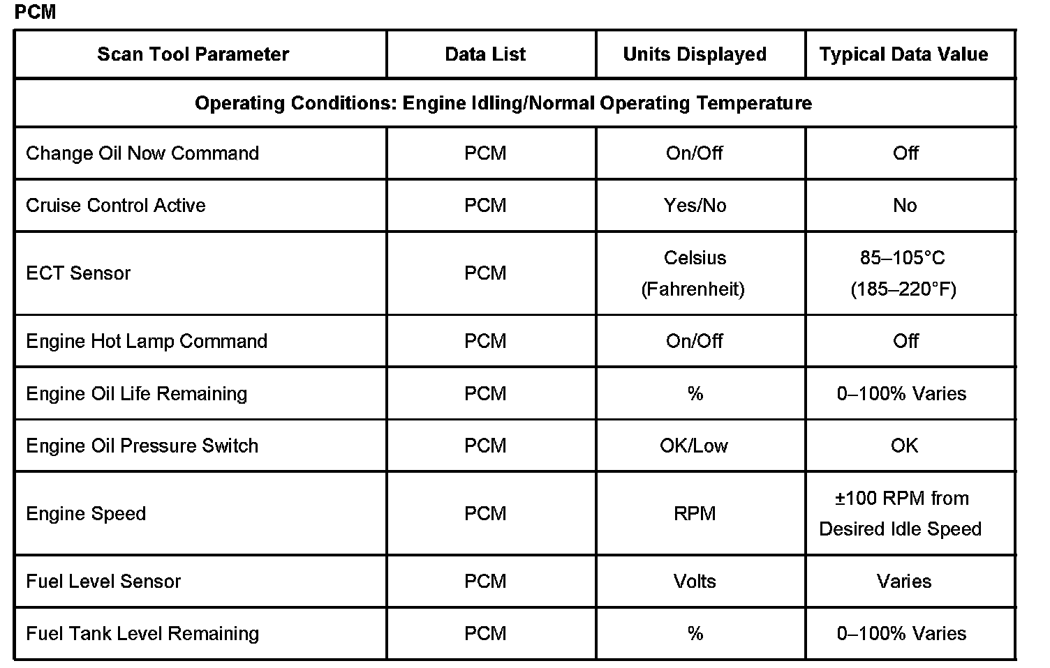 The typical data values are obtained from a properly operating vehicle under the conditions specified in the first row of the scan tool data list table.