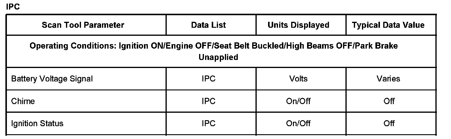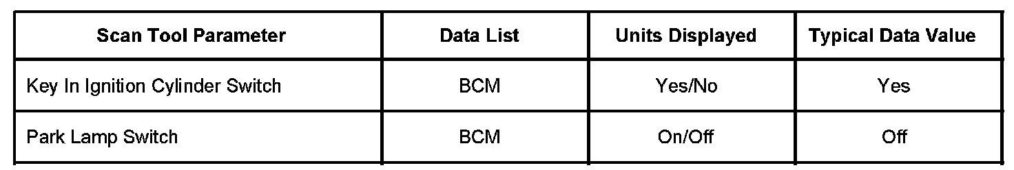 SCAN TOOL DATA LISTThe scan tool data lists contain all the instrument panel, gages, and console related parameters that are available on the scan tool. The parameters in the list are arranged in alphabetical order. The data list column indicates the location of the parameter within the scan tool menu selections.