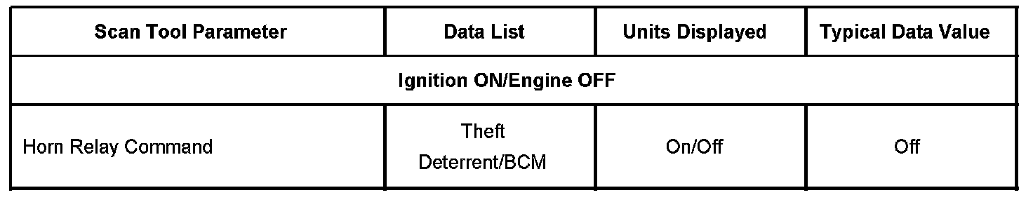 SCAN TOOL DATA LISTThe Horns Scan Tool Data List contains all of the horn related parameters that are available on the scan tool. The parameters in the list are arranged in alphabetical order. The column, "Data List," indicates the location of the parameter within the scan tool menu selections. Use the Horns Scan Tool Data List as directed by a diagnostic table or in order to supplement the diagnostic procedures. Begin all of the diagnostic procedures with Diagnostic System Check - Vehicle in Vehicle DTC Information.