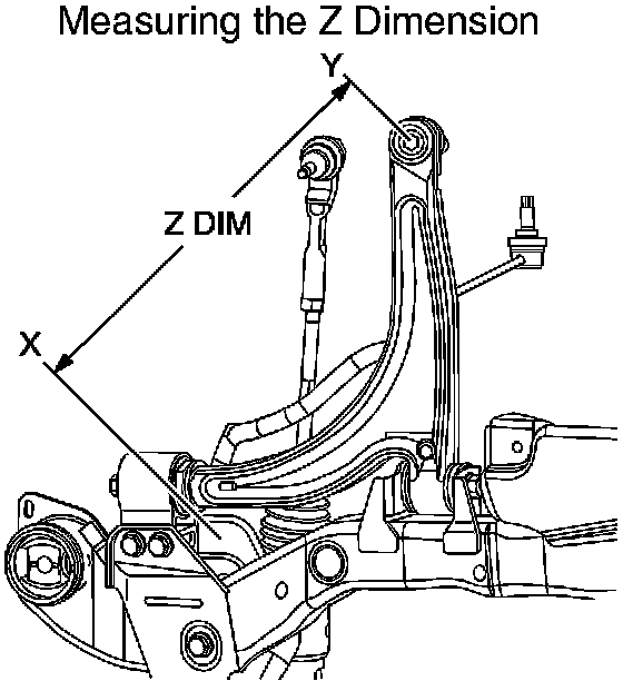 The Z height dimension measurement determines the proper ride height for the front end of the vehicle. There is no adjustment procedure. Repair may require replacement of suspension components.